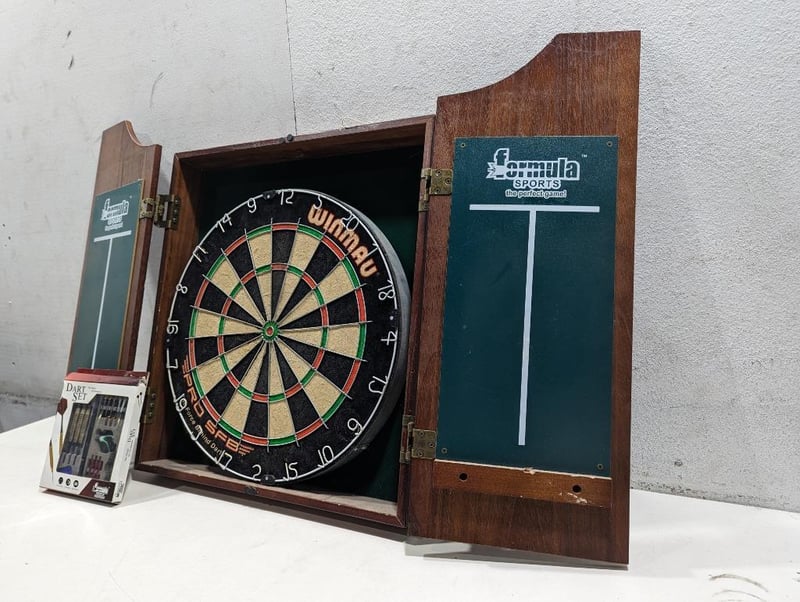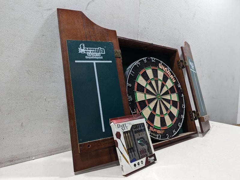 Classic Dart Board Setup, inside wooden Cabinet, Winmau Brand Dart Board. Dart Set Note, Signs of wear Sold as lot