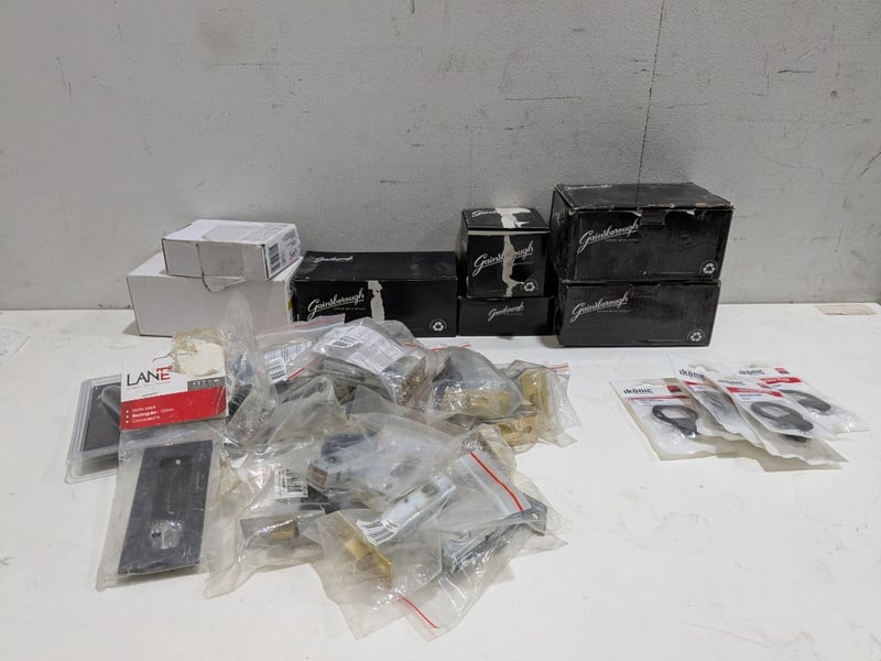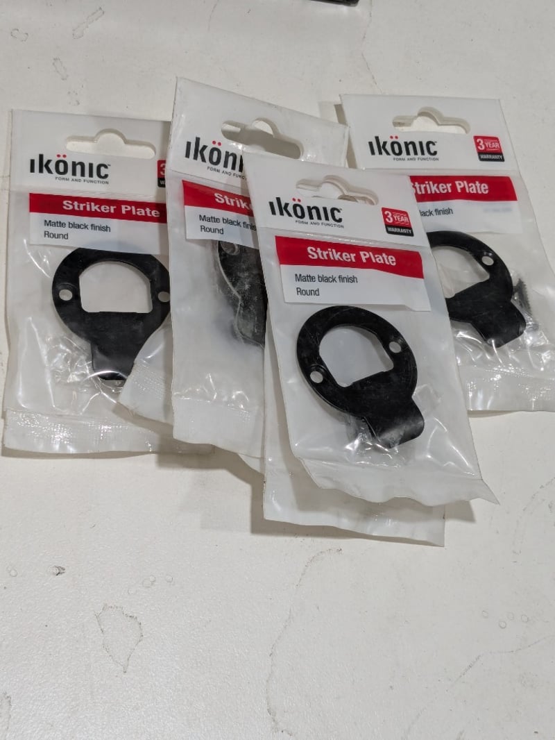 Assorted items including Iconic Striker plate Matte black finish round, Lane 120mm flush pull and more...Quantity to lot.Sold as a lot.Note: Signs of wear and tear, item untested, may have missing pieces.