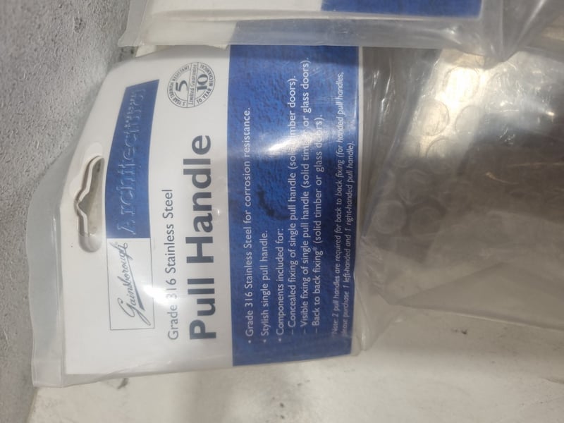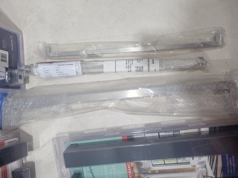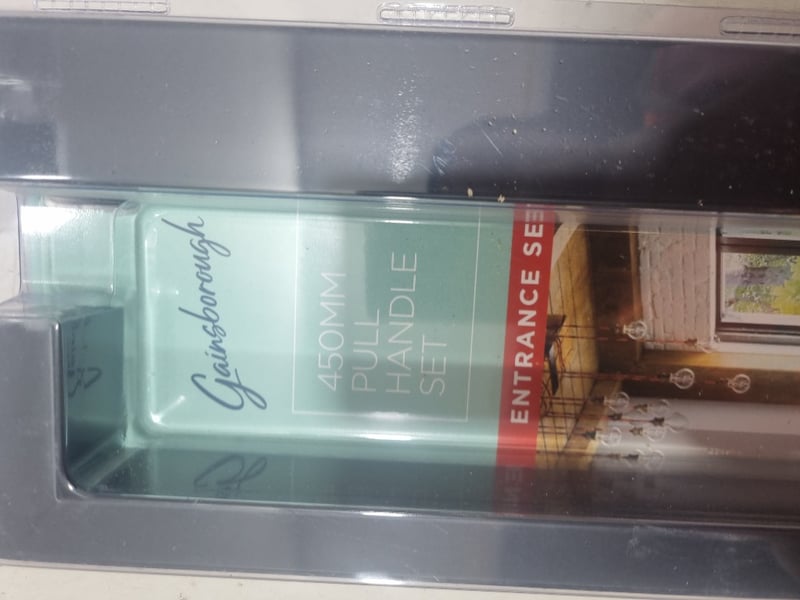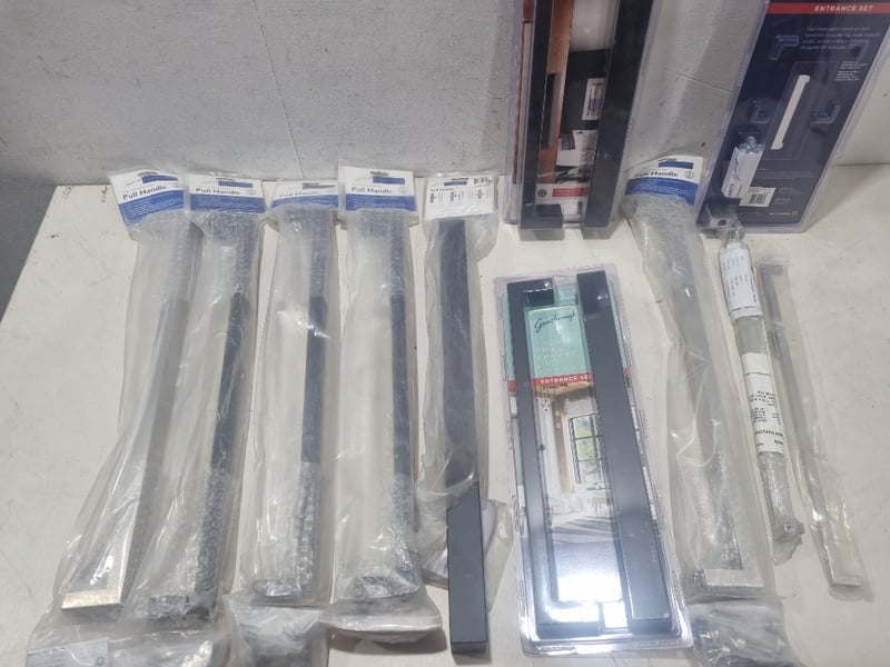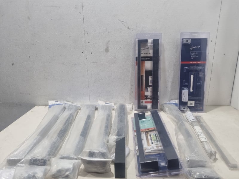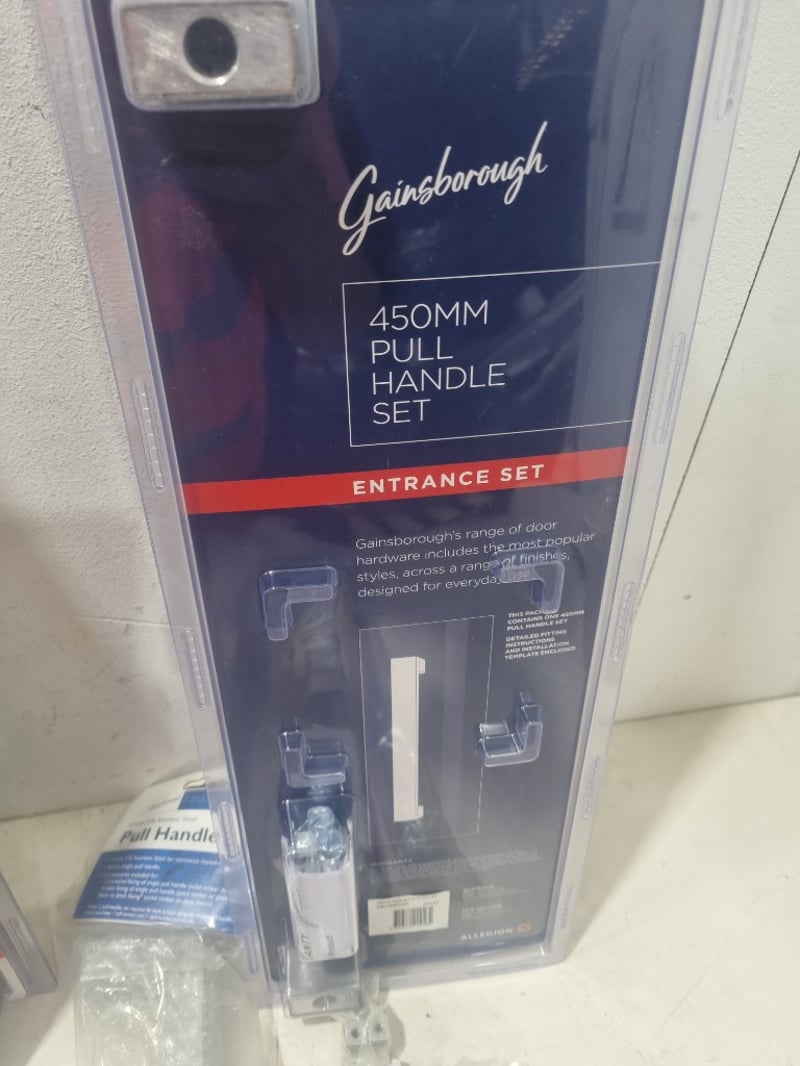 Gainsborough brand door hardware comprising multiple pull handle sets, chrome and black,various sizes
