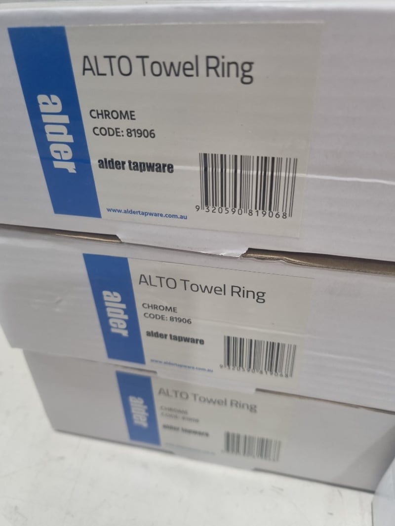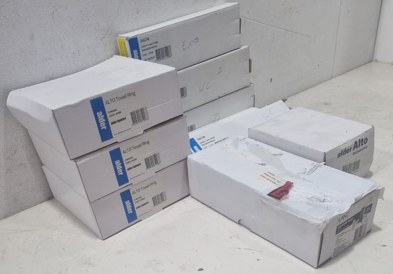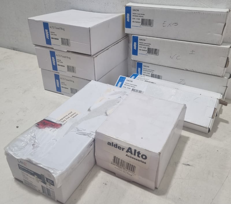 Bathroom and hardware accessories including lot,includes ALTO Towel Rings in Chrome (Code 81906),SACHI Towel Holders in Brushed Nickel (Code 31228), SACHI Towel Holders in various finishes, 1x Alder Alto Toilet Roll Holder, and 1x Lane Mortise Plus Lock in Satin Stainless Steel (60mm Backset, Keyless Exit, Model L998377). Sold as lot Note: untested and signs of wear