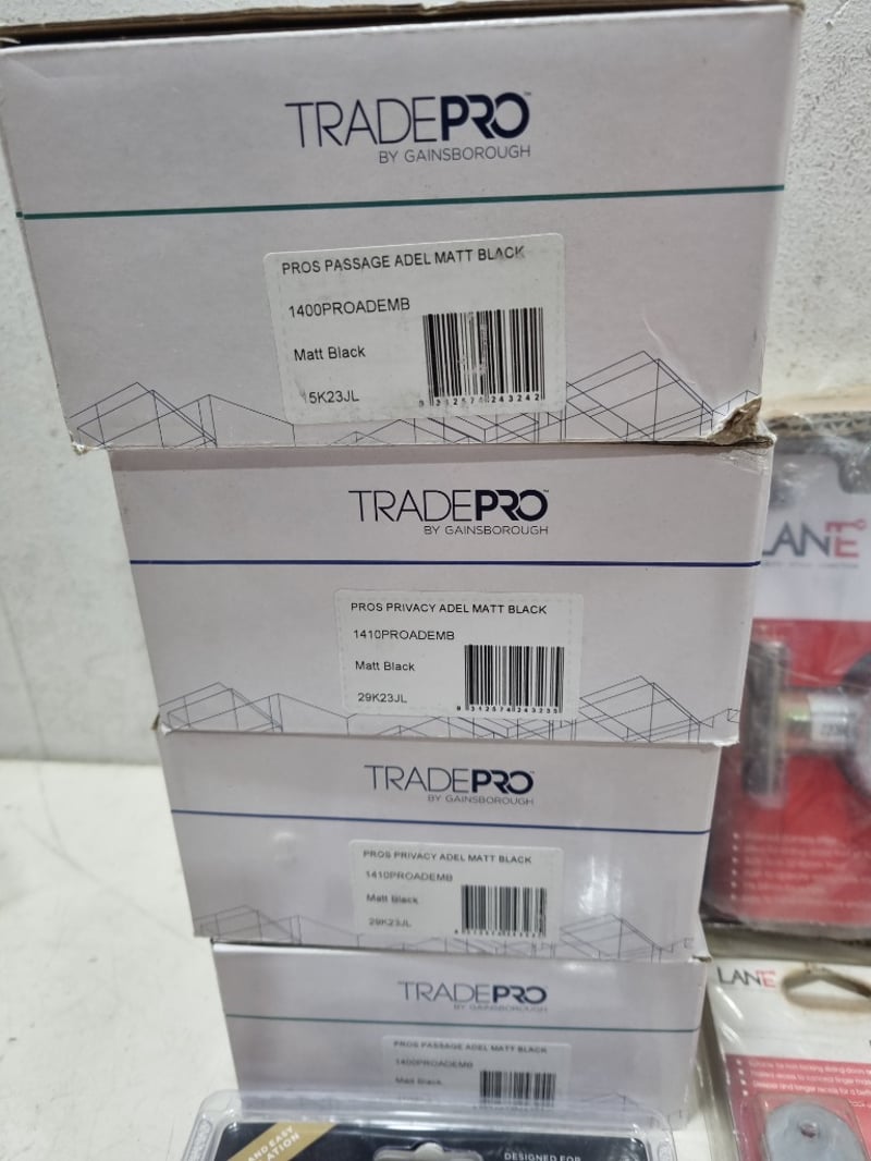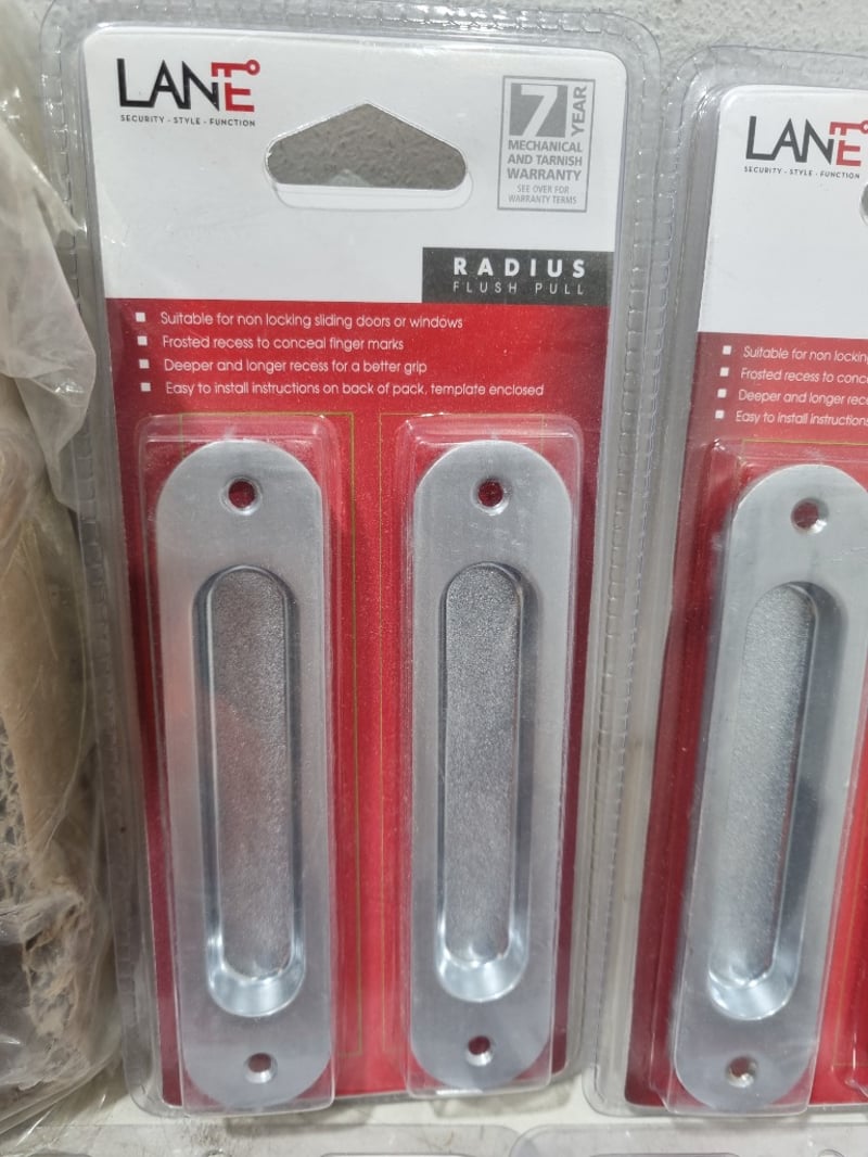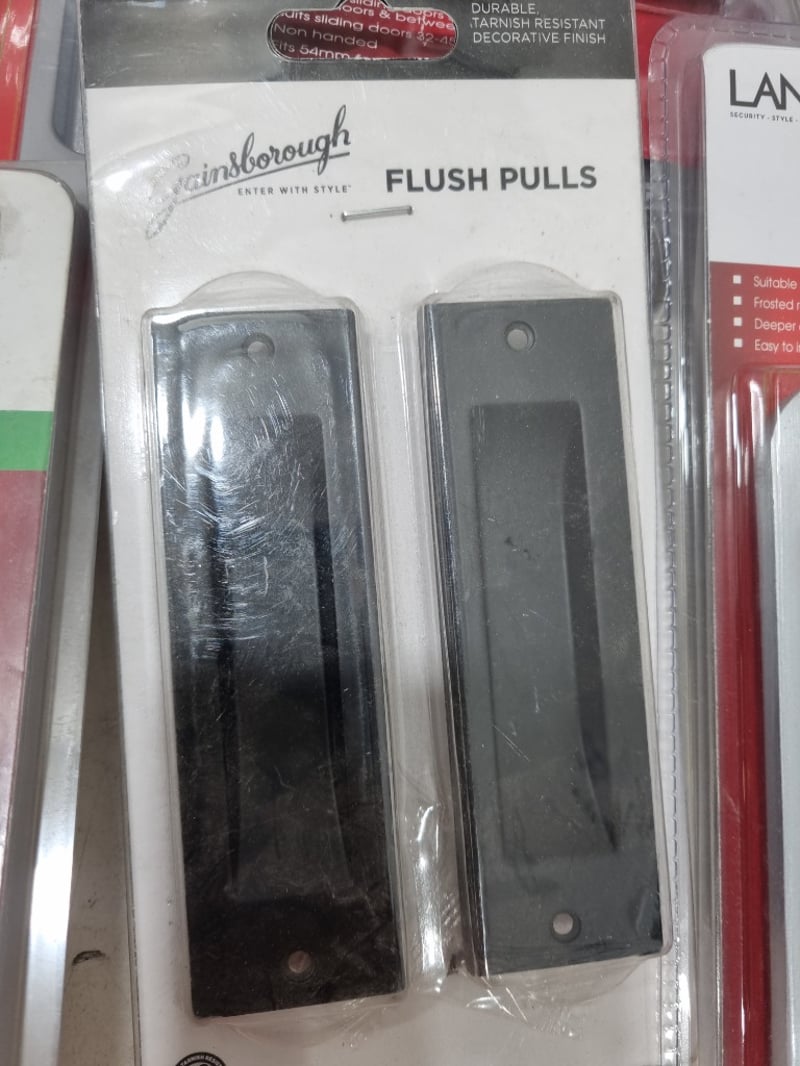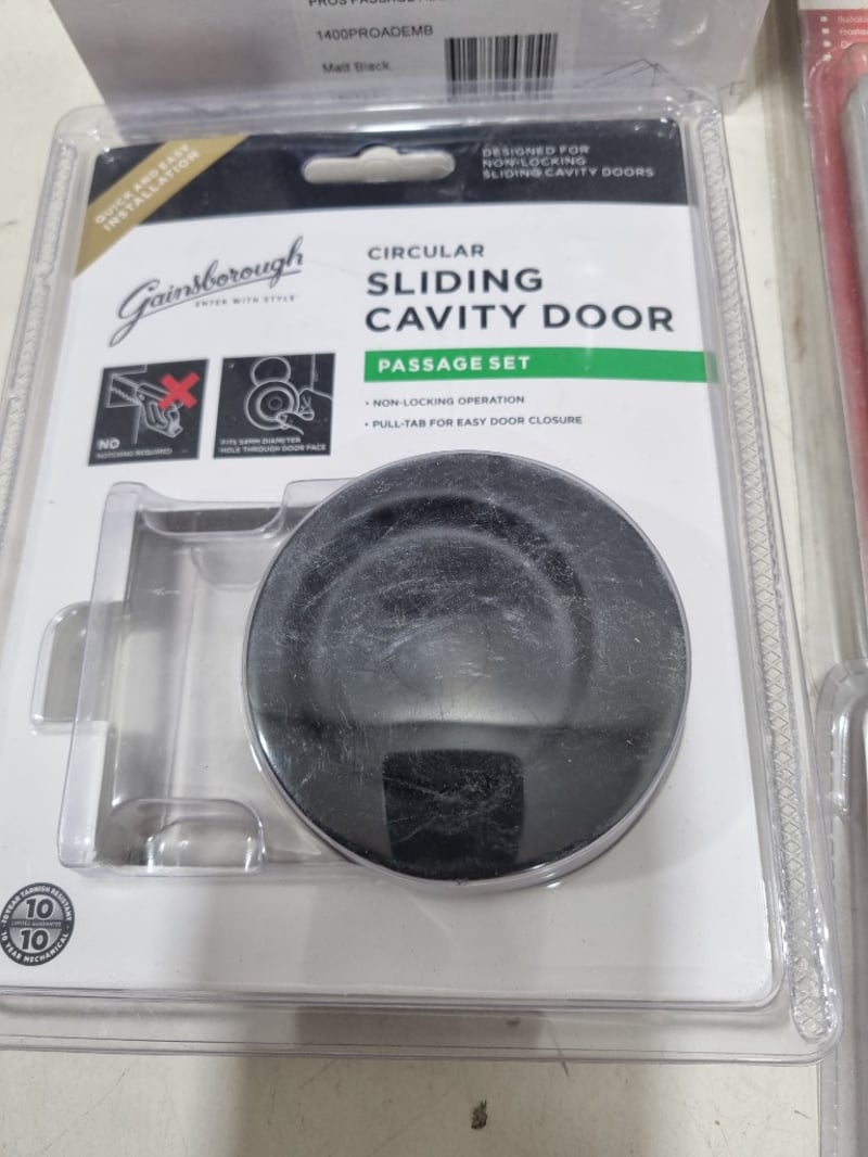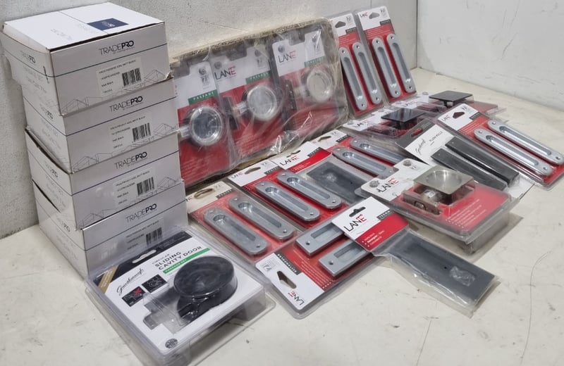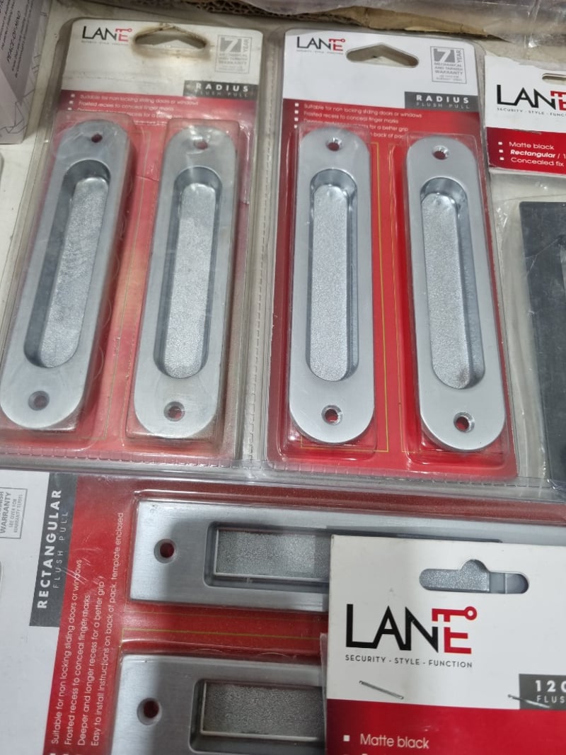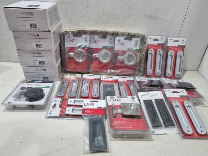 Assorted door accessories lot, includes passage cavity sliders,flush pulls,passage sets and more ..... various colours chrome,matt black and more .. Sold as lot Note: untested and signs of wear