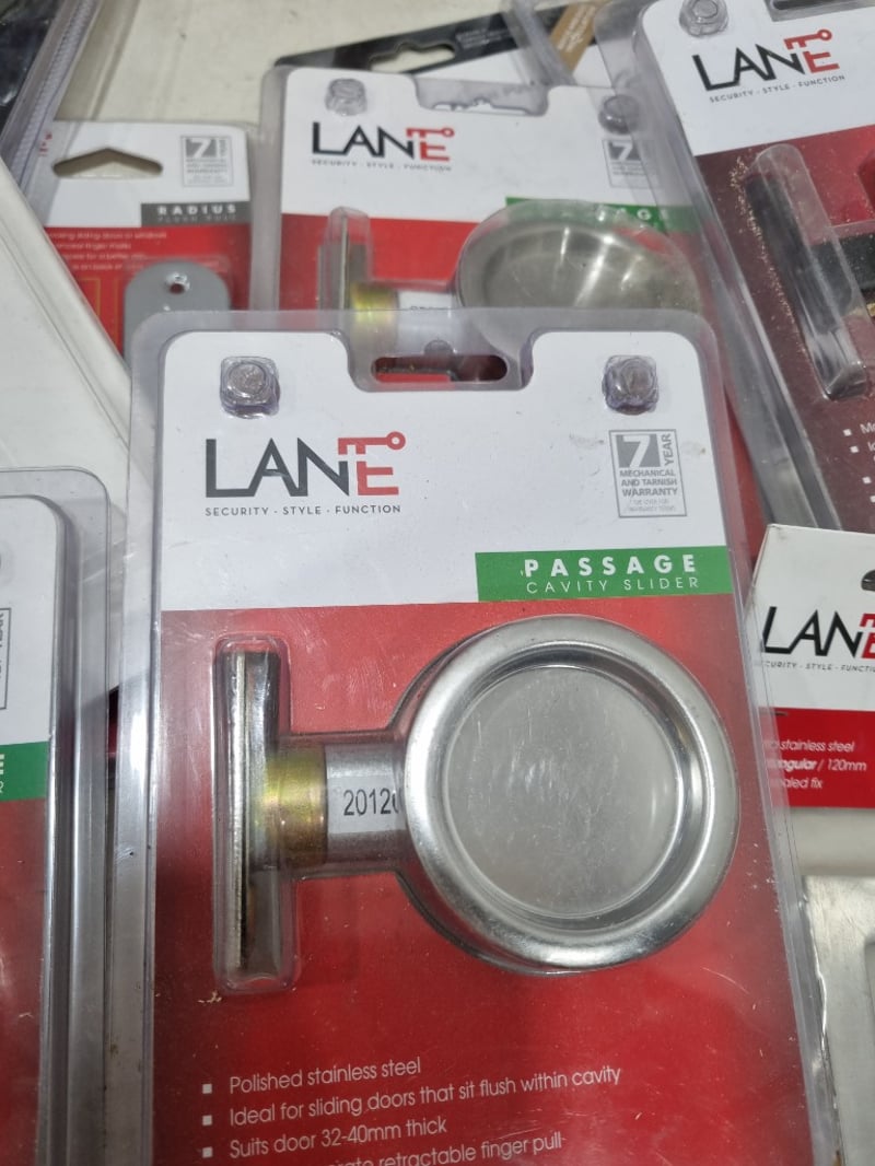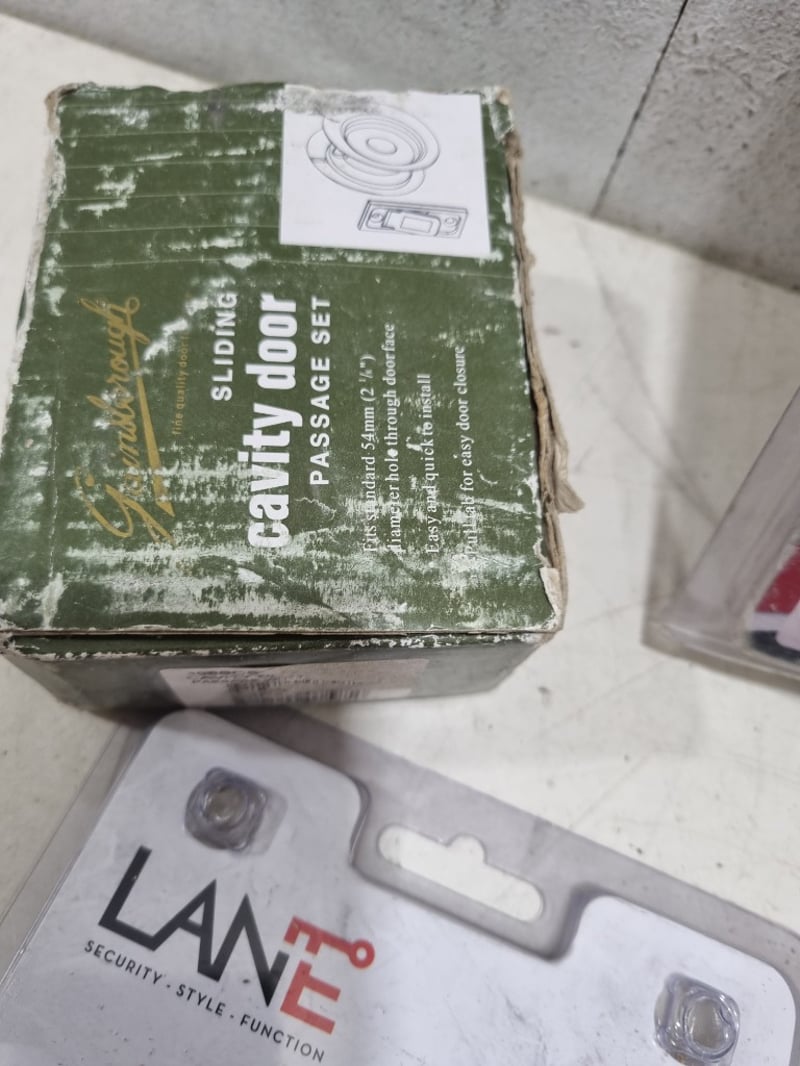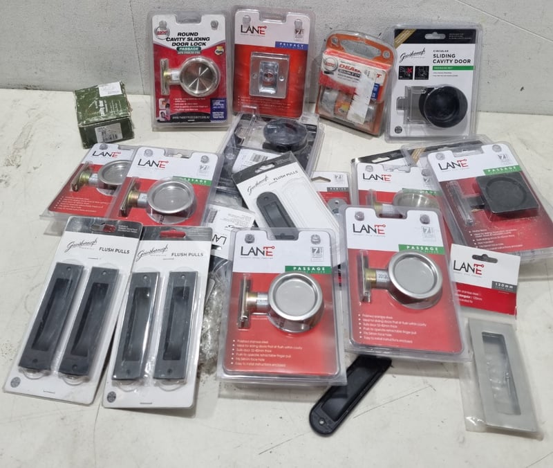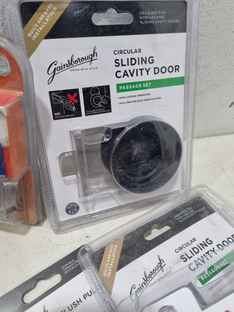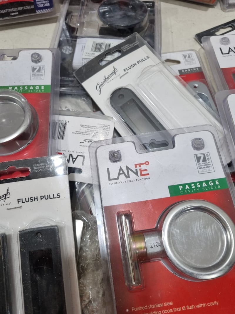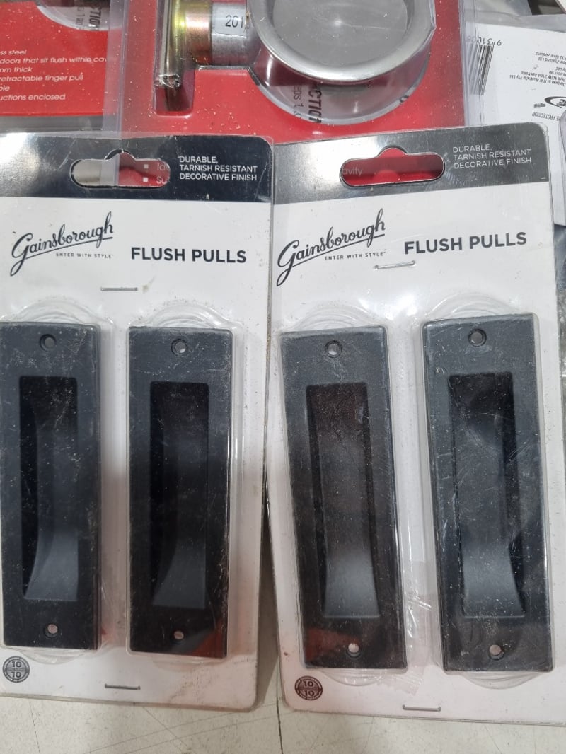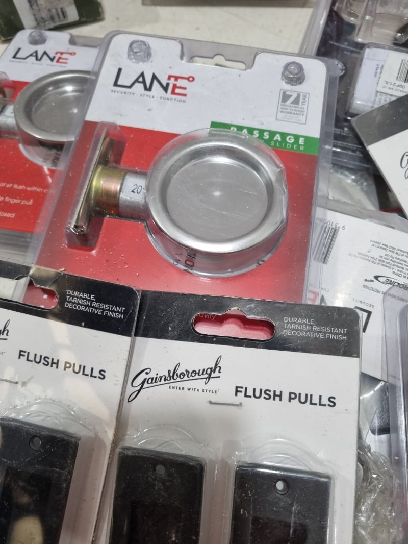 Assorted door accessories, includes round cavity sliding door lock,flush pulls and more.....stainless steel, matte black Sold as lot Note: signs of wear