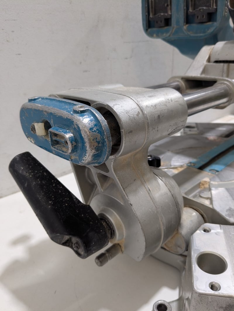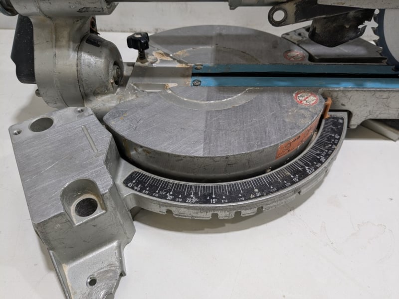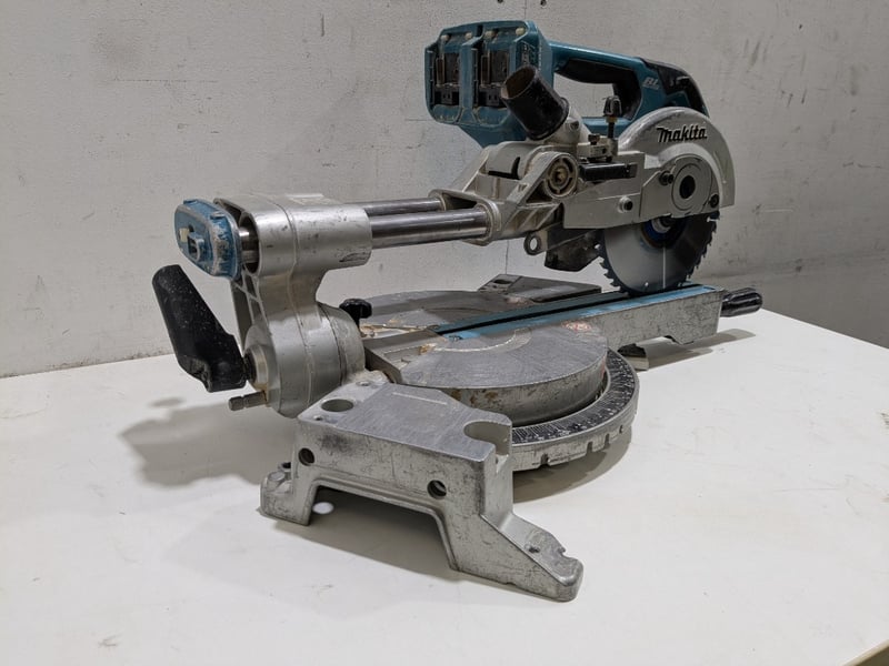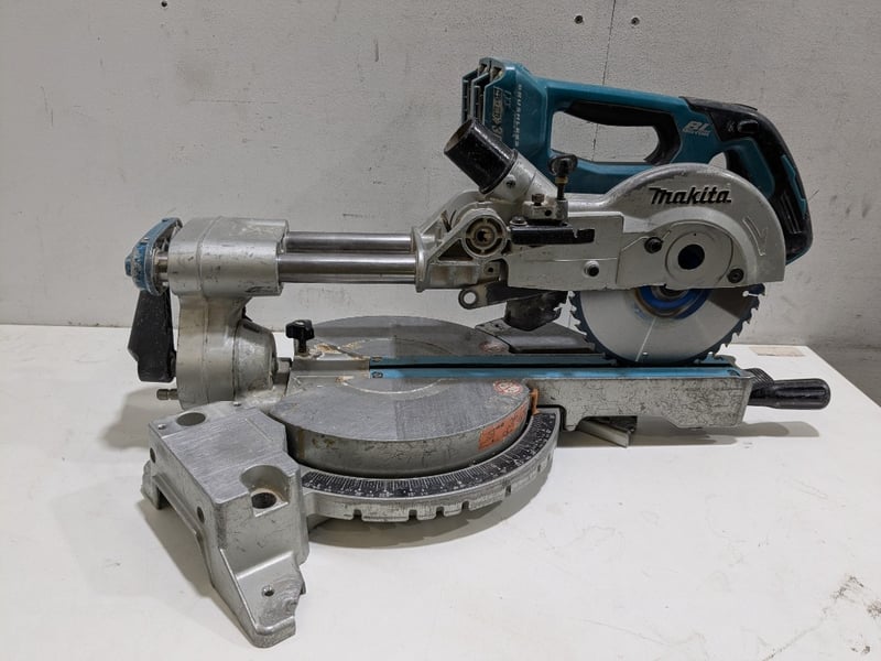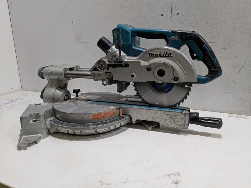Makita 18V Brushless Compact Mitre Saw, model DLS714.Note: Signs of wear and tear, item untested
