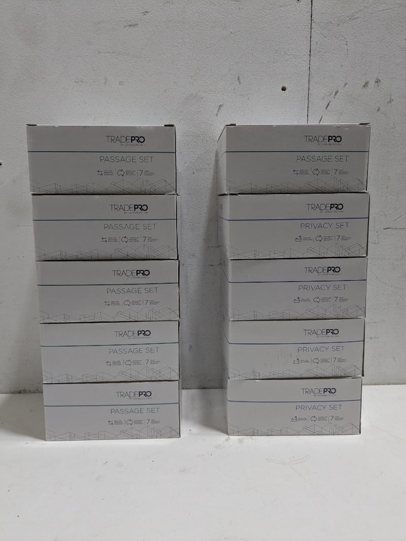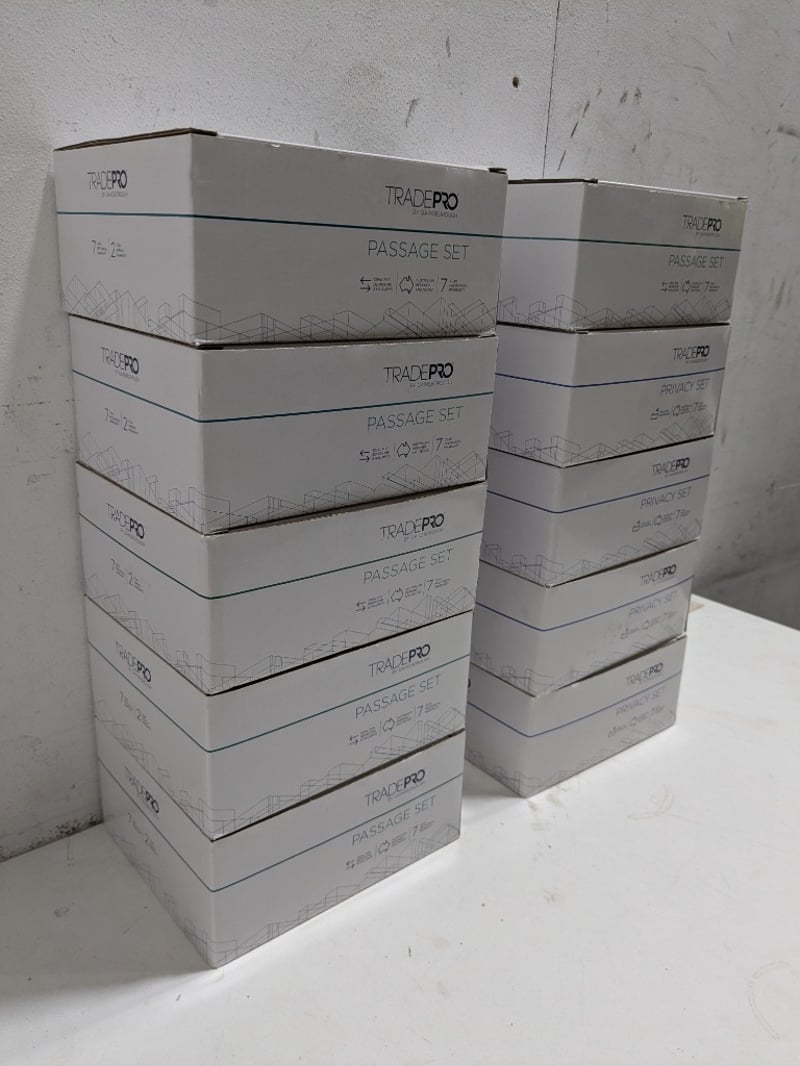 Lot of TradePro passage and privacy door handle sets. Black matte colour.Quantity to lot.Sold as a lot.Note: Signs of wear and tear, item untested, may have missing pieces.