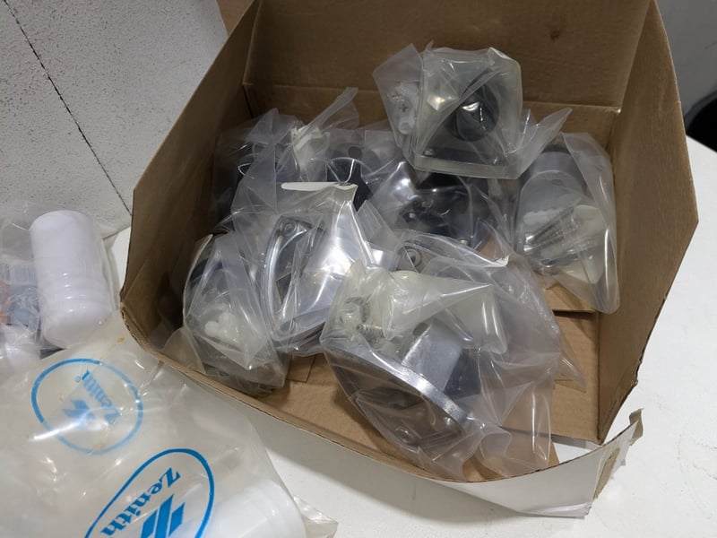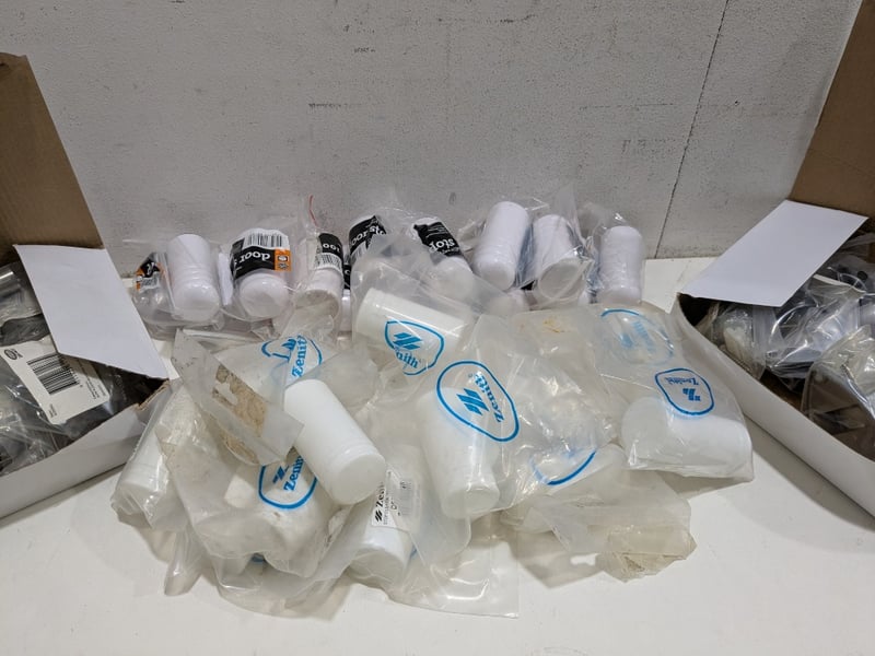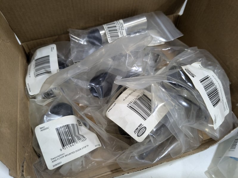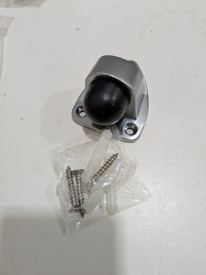 Lot of door stops assorted brands and shapes including plastic and metal.