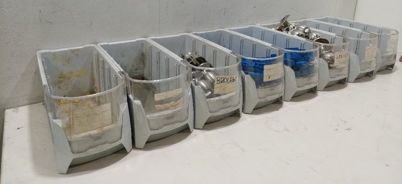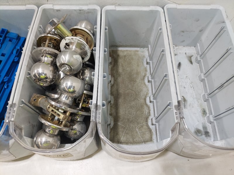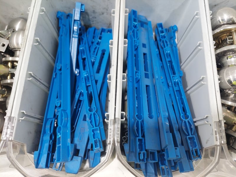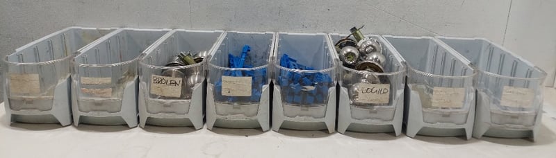 Assorted lot includes stainless steel ball-shaped entrance lockset, modular brackets and Sortimo storage containers.