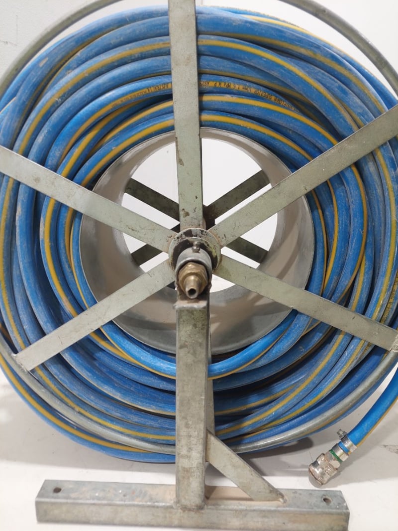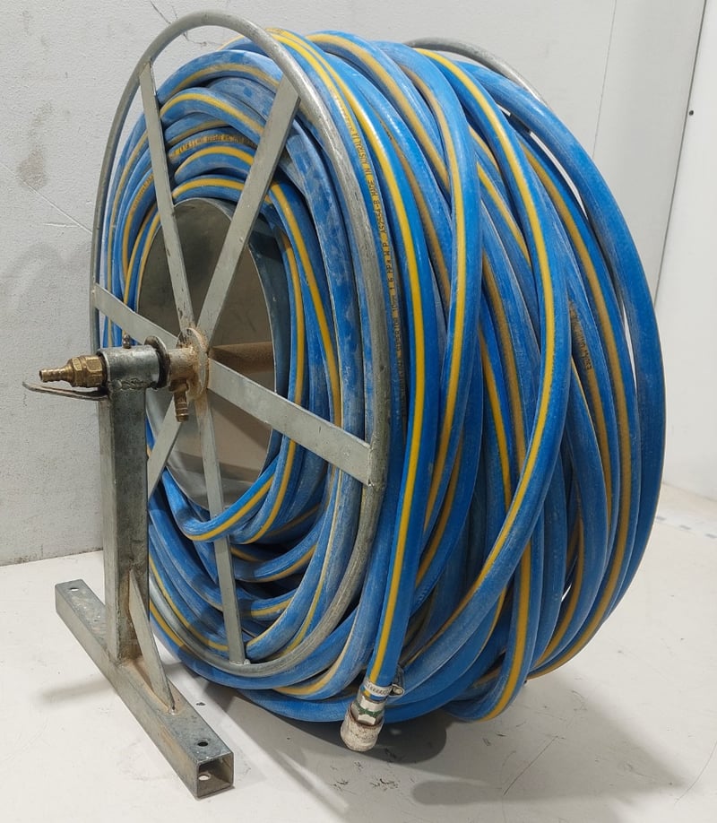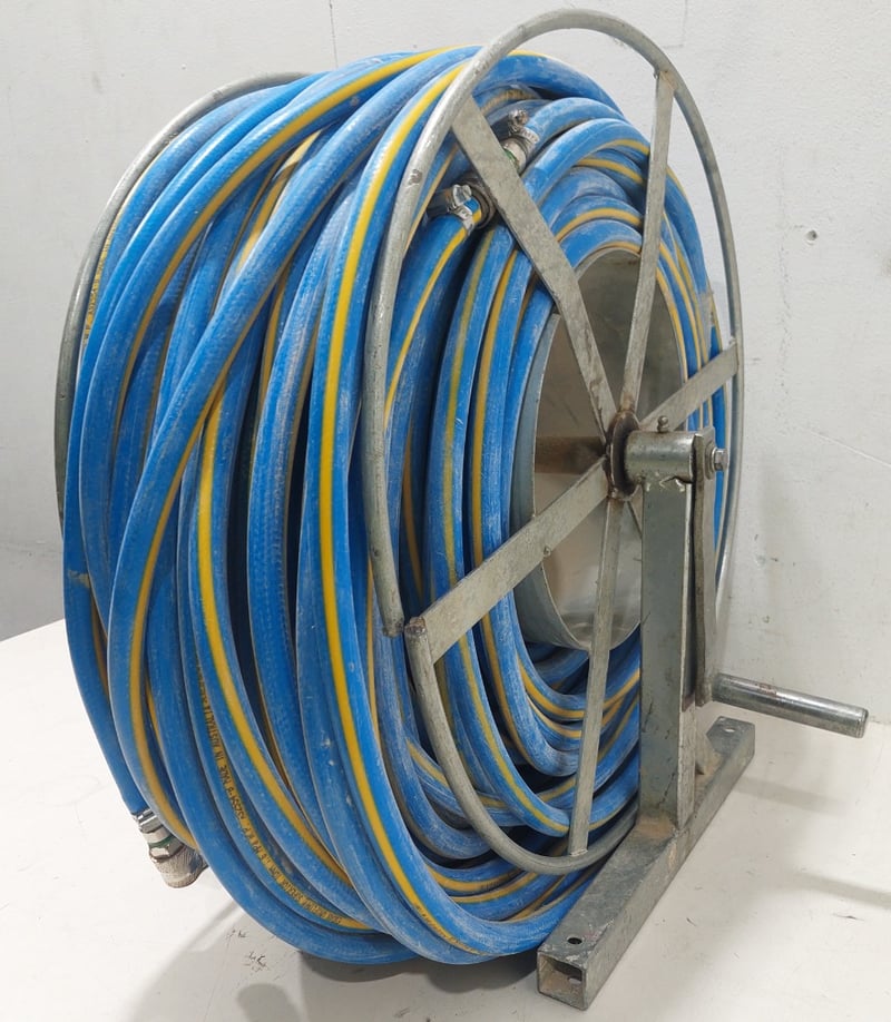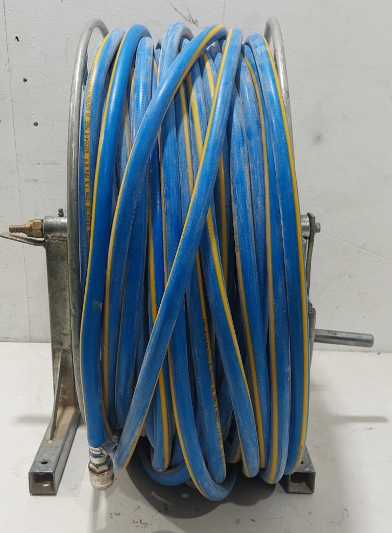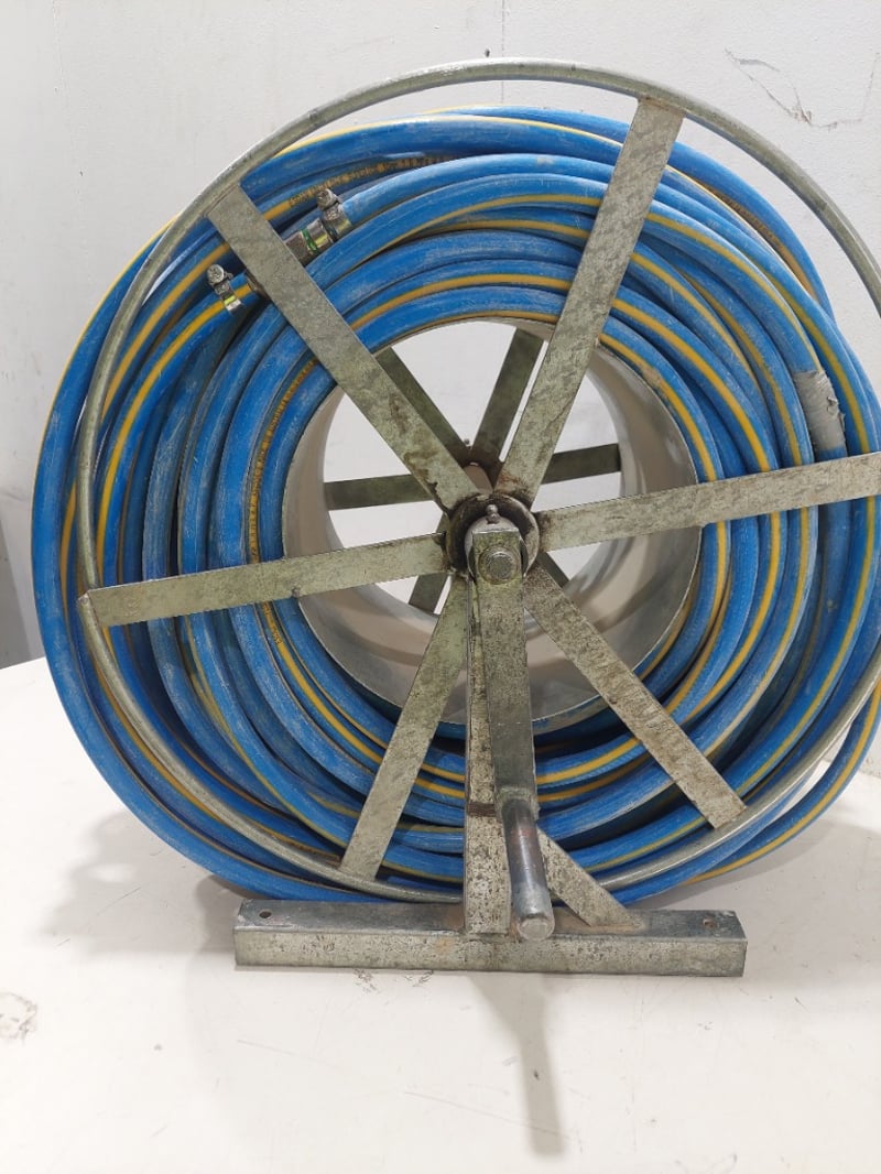 Industrial-style wall-mounted hose reel used for storing and deploying hoses for water, air, or other fluids. Notes: item untested and signs of wear.