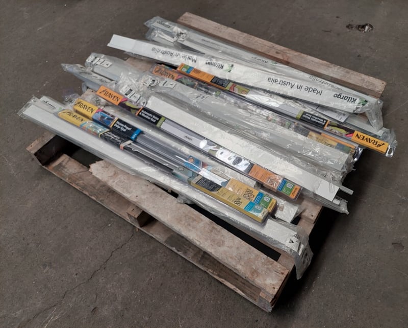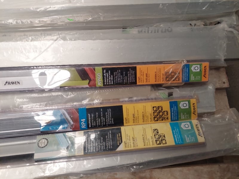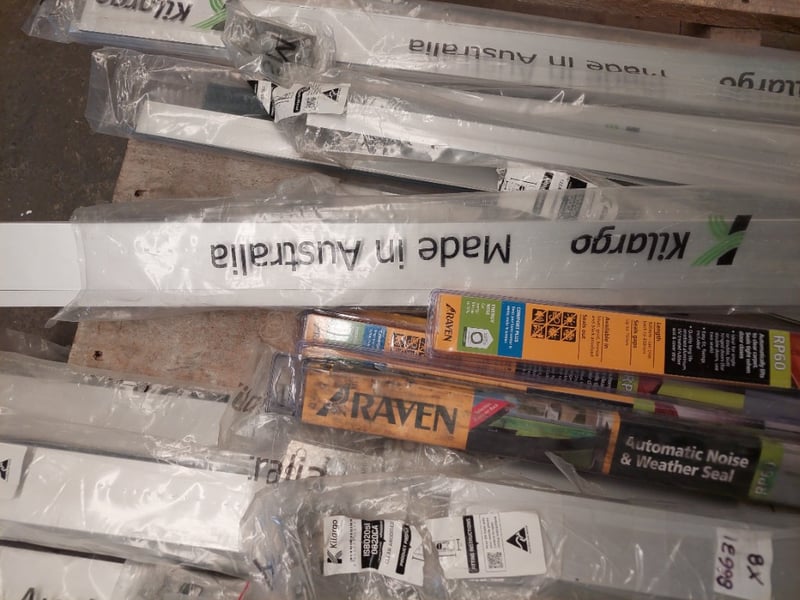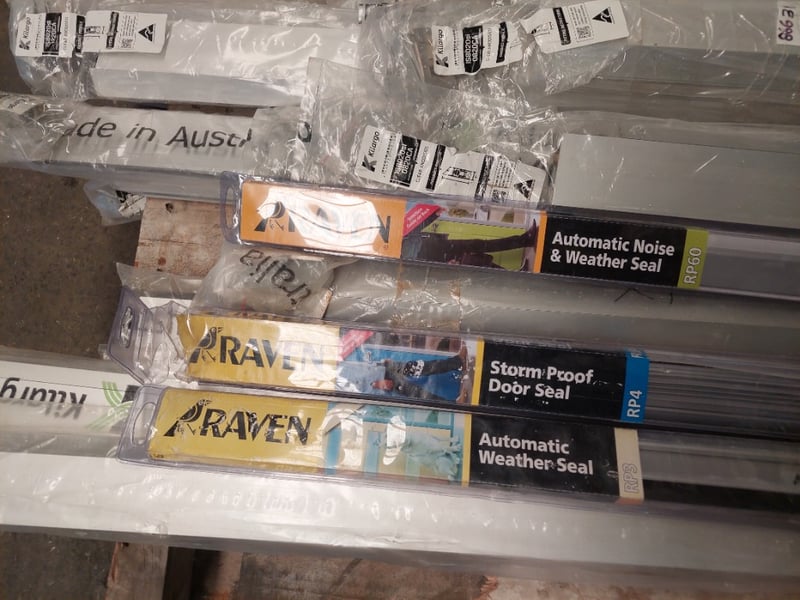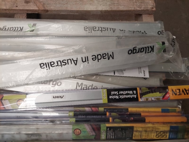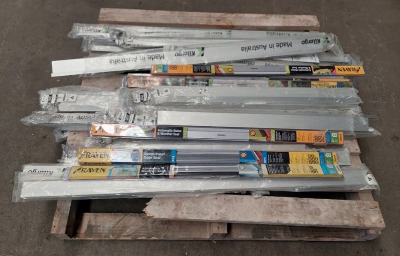 Assorted lot of door seals, Kilargo and Raven brand, storm proof door seals, automatic weather seals and more.. Qty to pallet Dims range from 122cm to 84cm Sold as a lot. Notes: items untested and signs of wear.