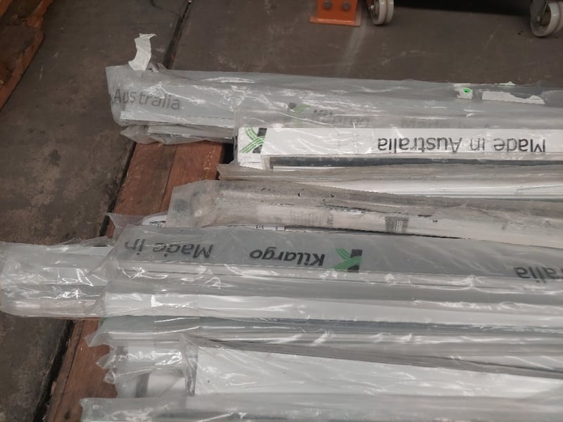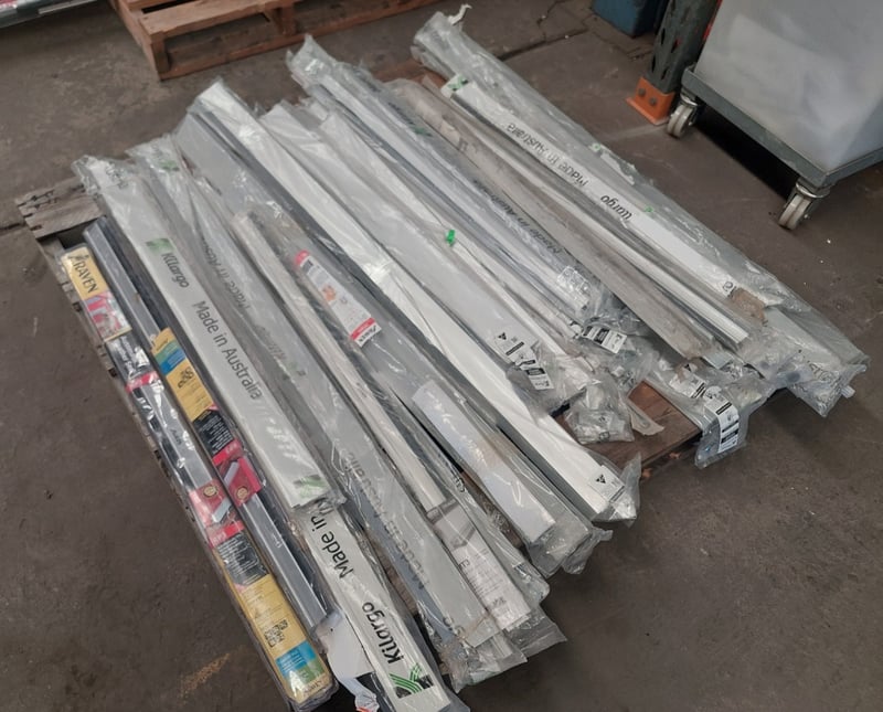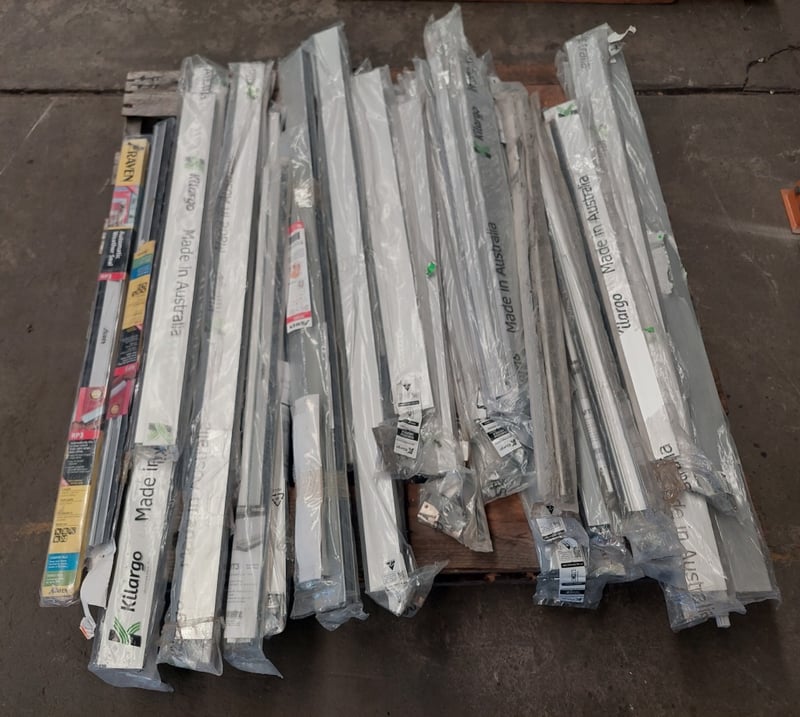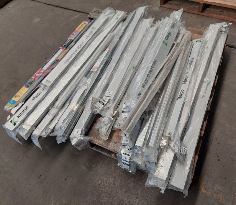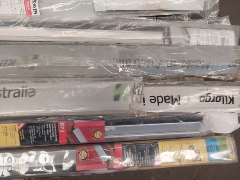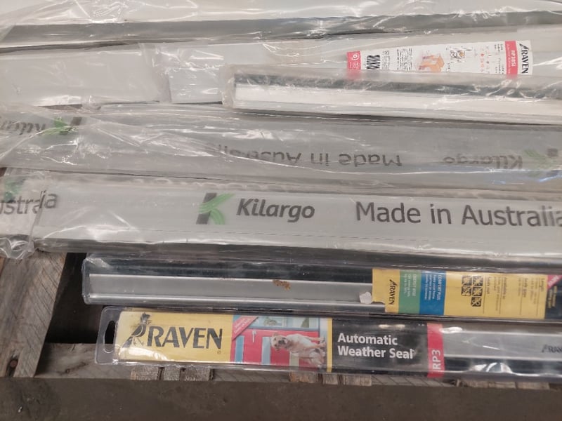 Assorted lot of door seals, Kilargo and Raven brand, storm proof door seals, automatic weather seals and more..Qty to pallet Dims range from 122cm to 84cmSold as a lot.Notes: items untested and signs of wear.