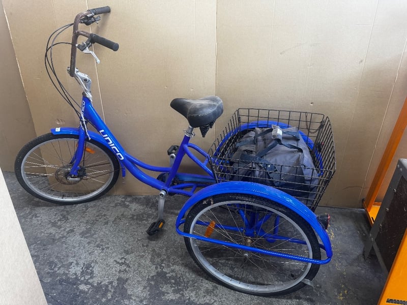 Bike, Unico adult tricycle, including rear basket, gear with bag and vintage kids pram