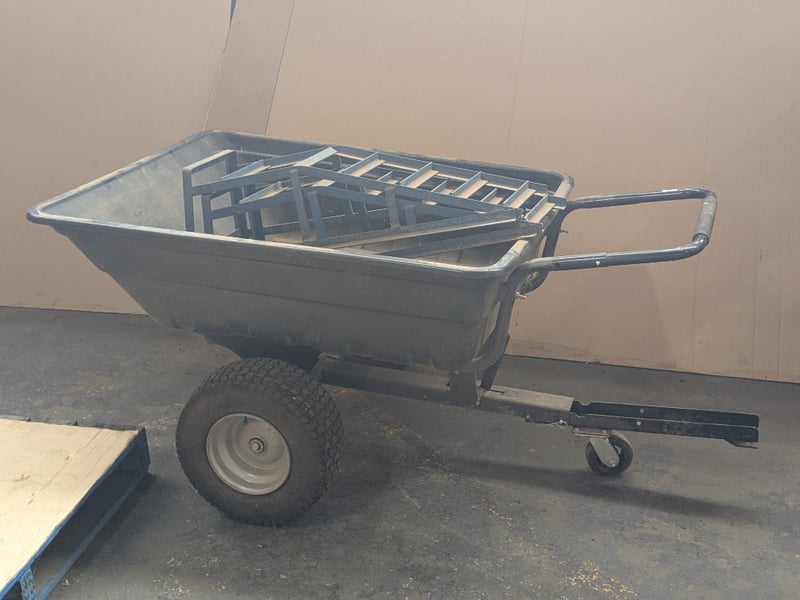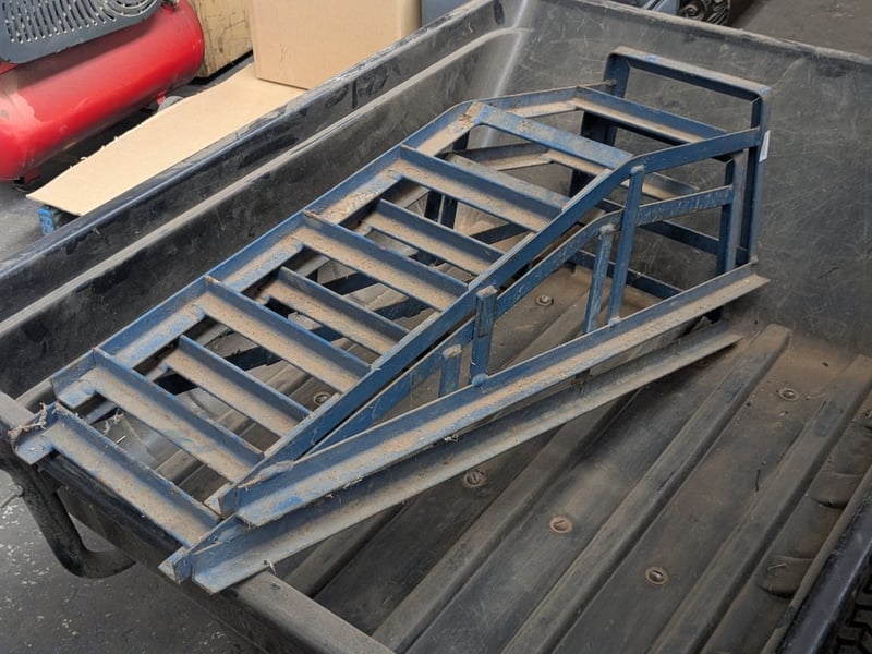 Tools, including Poly tipper garden cart 250L and vehicle ramps