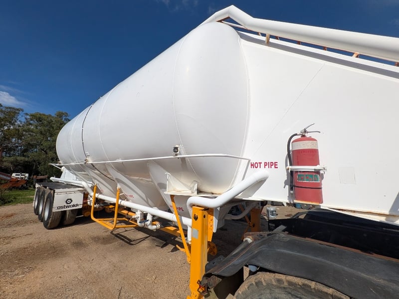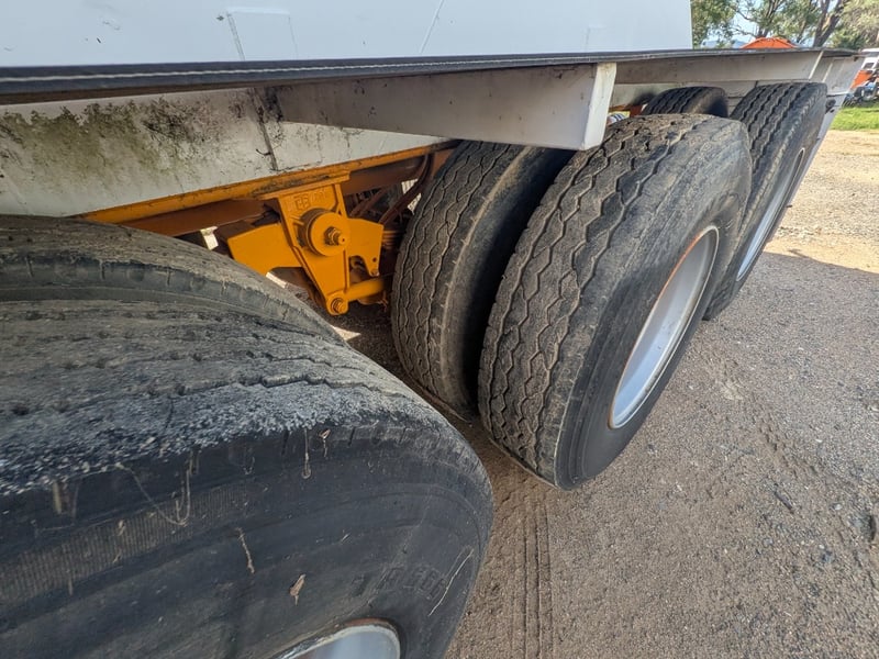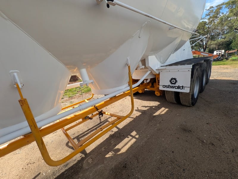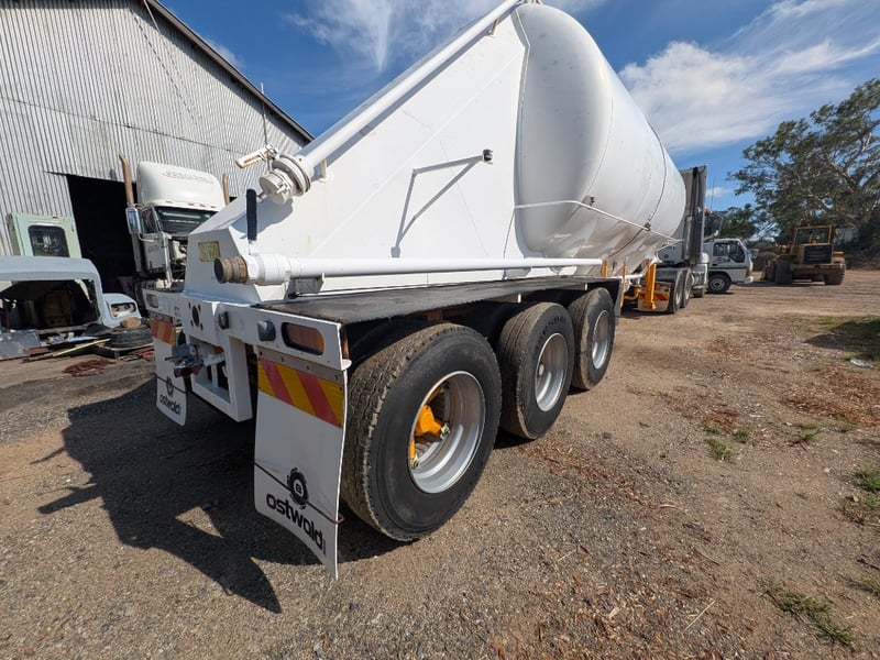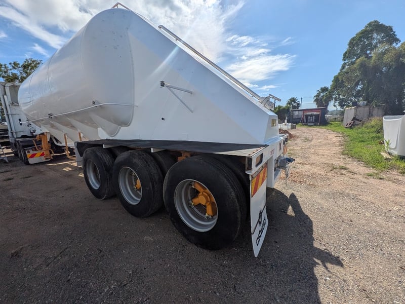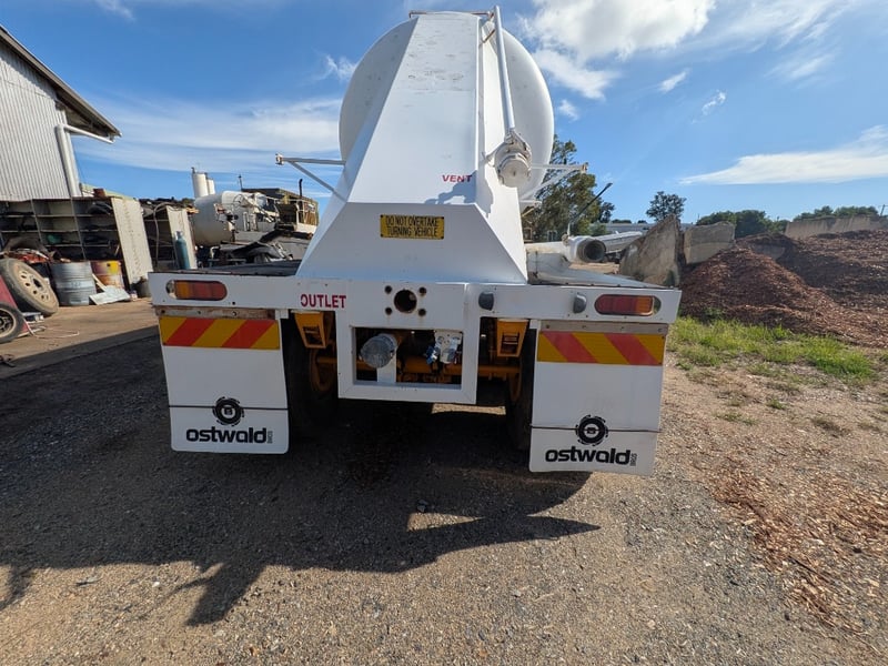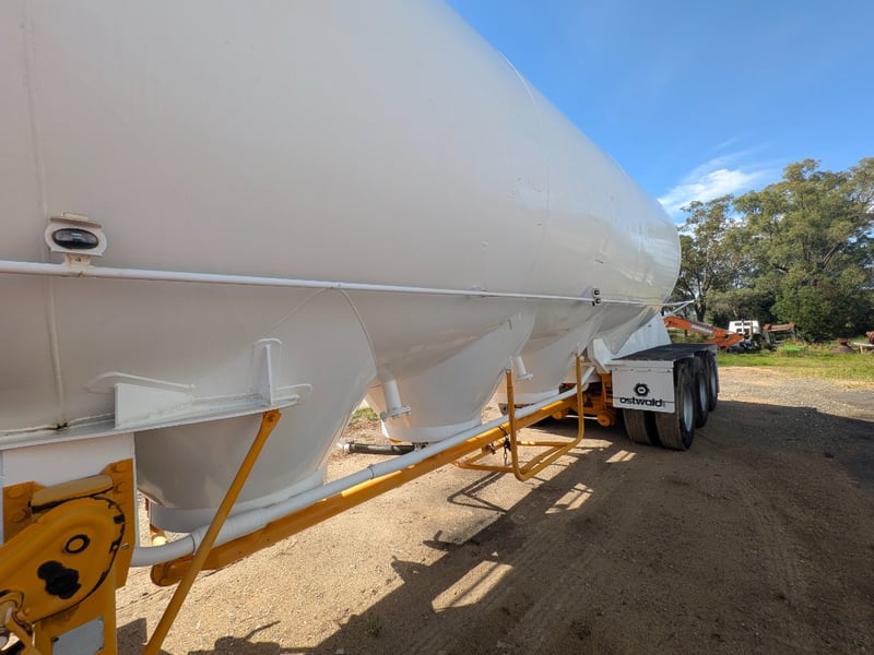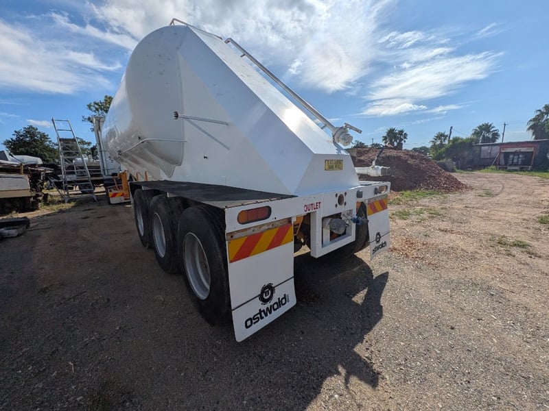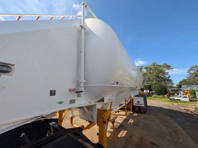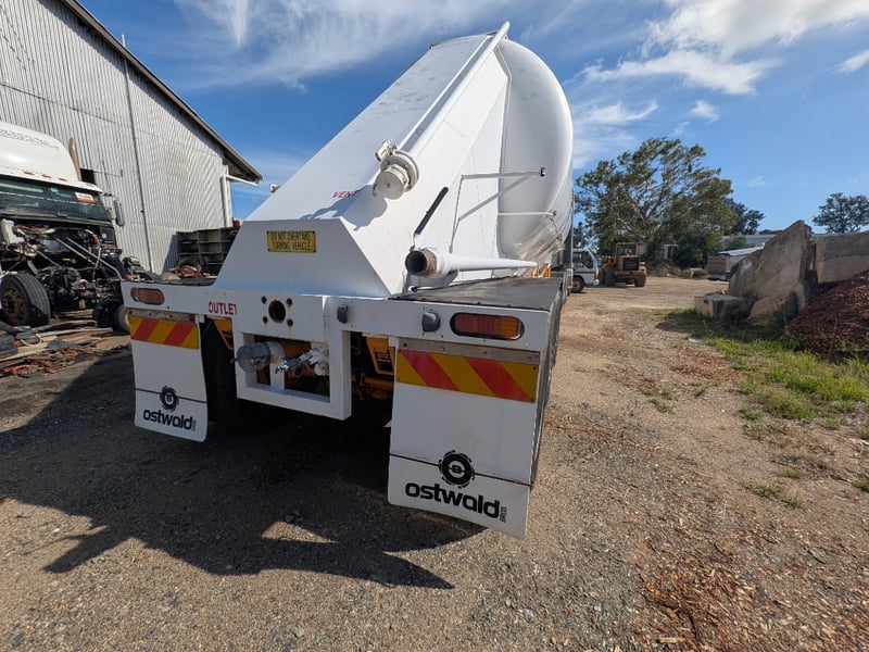 Tri Axle Tanker Trailer Type: Tri Axle Tanker Trailer Configuration: 3 Axle – Airbag Suspension Colour: White Tank / Yellow Chassis Notes/Extras: Fully Refurbished, Repainted, Fitted with new Valves/ Features: Large cylindrical steel tank, Insulated tank design, Top ladder access, Rear lights & reflectors fitted, Ostwald branded mudflaps