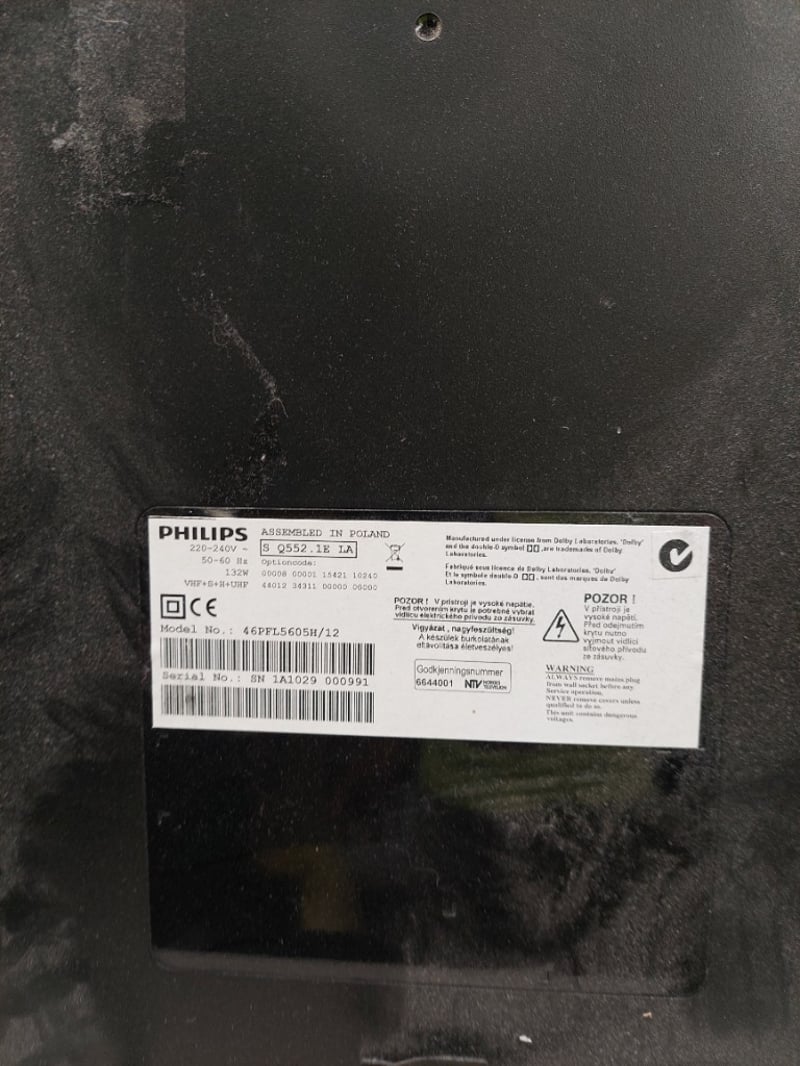 Philips 46inch Television.Model number: 46PFL5605H/12Serial number: 1A1029 000991Dims: 112cm L, 67cm H, 7cm WIncludes 2m VGA cable.Note: Item is untested, remote not included.