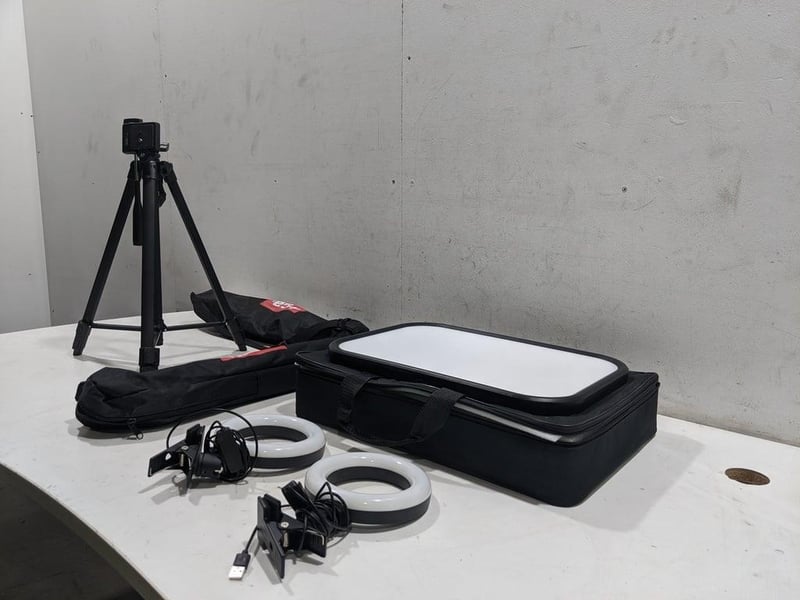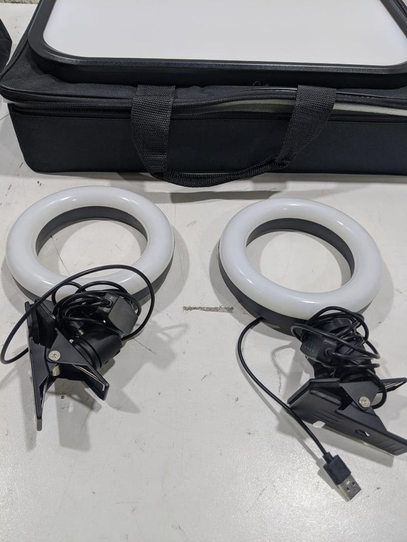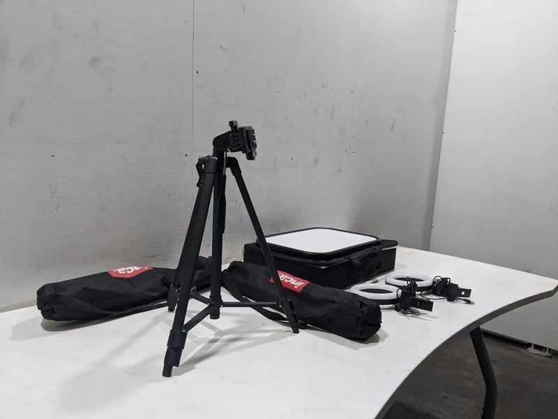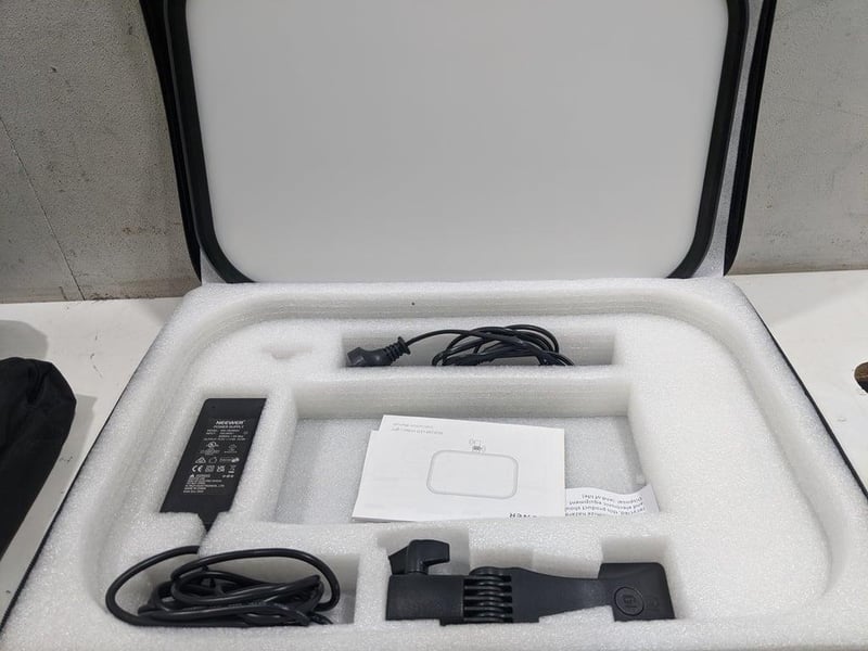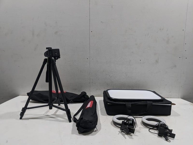 Assorted Lighting and Stands • Inca Stand, QTY x 2 • Circular Lights, QTY x 2 Rectangular Light, Neewer, QTY x 1 Sold as Lot