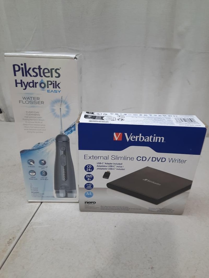 1 x PIKSTERS HydroPik easy water flosser, RRP:$89.50, NEW factory sealed in box, 1 x VERBATIM external slimline CD/DVD writer, RRP$99.00, NEW in box