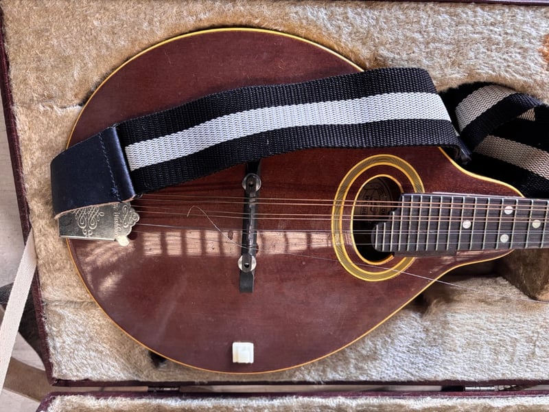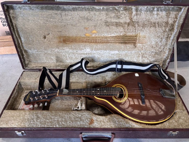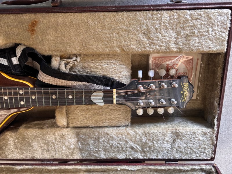 Washburn mandolin musical instrumentNote; wear and tear on storage box, strings are damaged