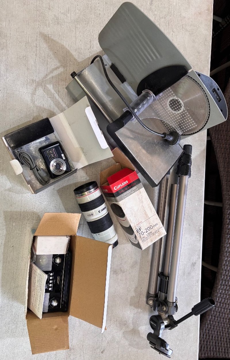 Mixed box of Eurolab Meat & Food Slicer, tripod, camera, etc.