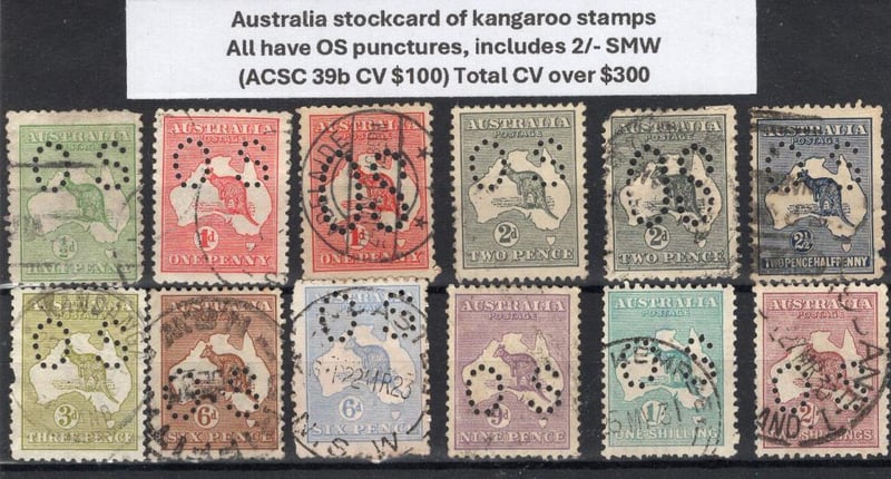 Australia stockcard of kangaroo stamps 1913-1936 all have OS (Official Service) punctures to 2/-