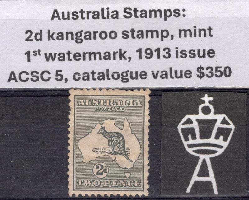 Australia Stamps: 2d kangaroo stamp, mint, 1st watermark 1913 issue, ACSC 5