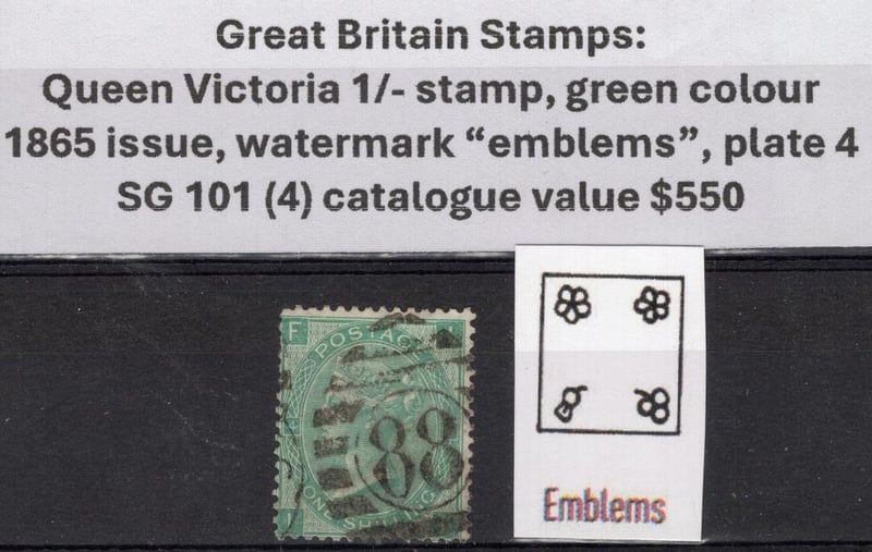 Great Britain Stamps: Queen Victoria 1/- stamp, green colour, 1865 issue, watermark "emblems", plate 4, SG 101 (4)