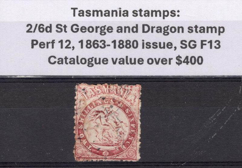 Tasmania Stamps: 2/6d St George & Dragon stamp perf 12, 1863-1880 issue, SG F13