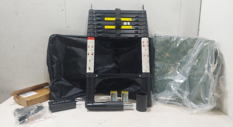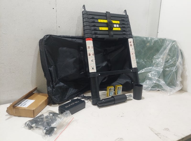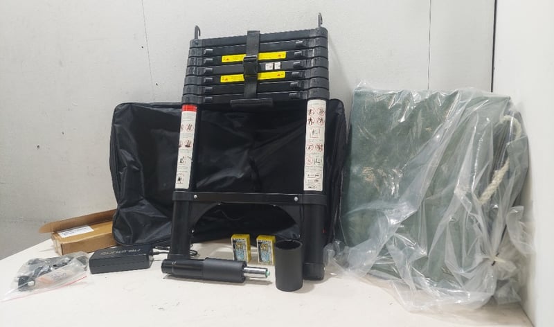Assorted lot includes, portable foldable ladder, tarp, battery charger and more... Sold as a lot. Notes: items untested and signs of wear.