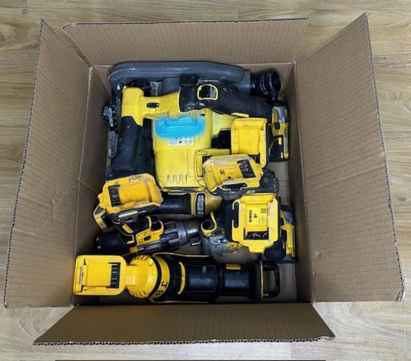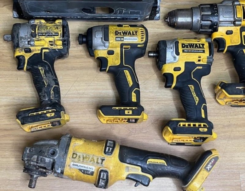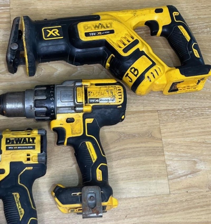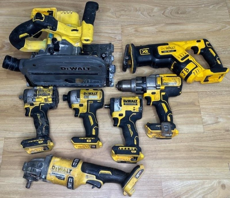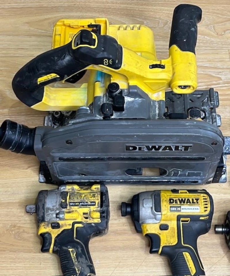 Cordless DeWalt tools. 1 x DCS520 circular saw (18V), 1 x DCF787 impact driver (18V), 1 x DCF860 impact driver (18V), 1 x DCF922 impact driver (18V), 1 x hammer drill (18V), 1 x DCS367 reciprocating saw (18V), 1 x DCG414 angle grinder (54V). Skins only, no batteries. Condition: Not working, untested, for parts or repair.