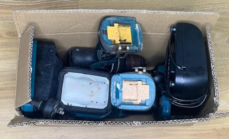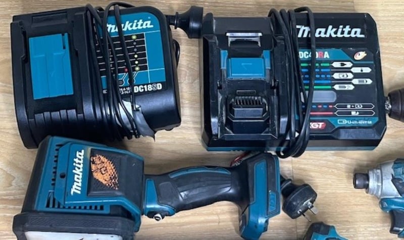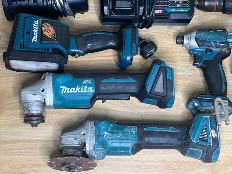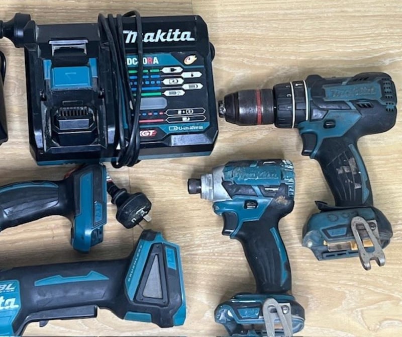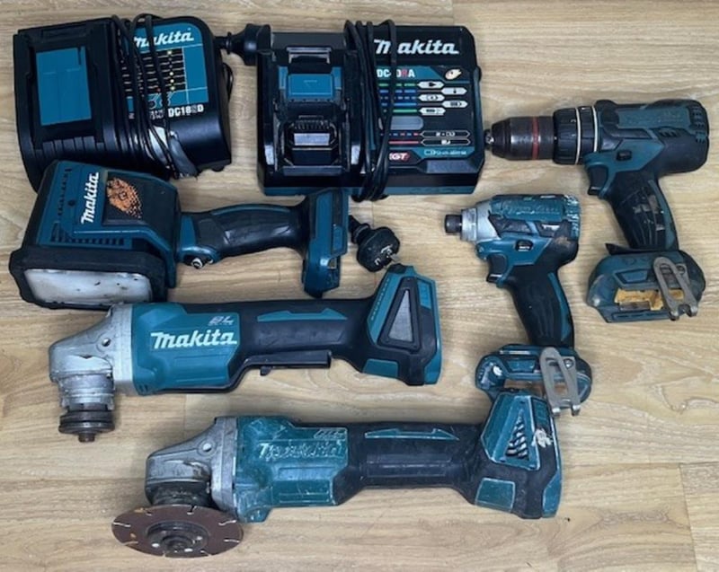 Cordless Makita 18V tools. 1 x DHP480 hammer drill, 1 x DTD impact driver, 1 x DML812 torch, 2 x angle grinders, 1 x DC18SD charger, 1 x DC40RA charger. Skins only, no batteries. Condition: Not working, untested, for parts or repair.