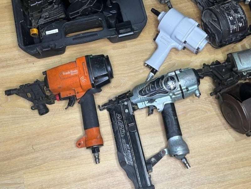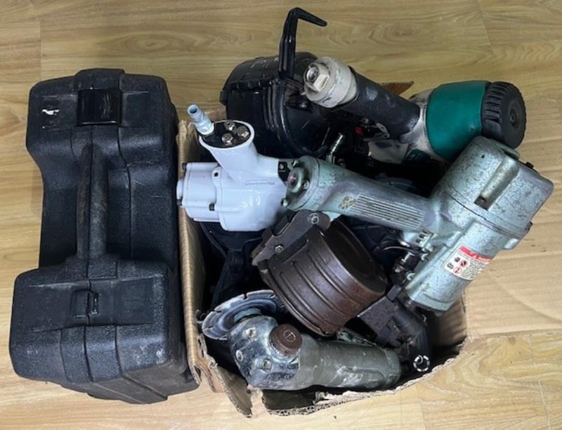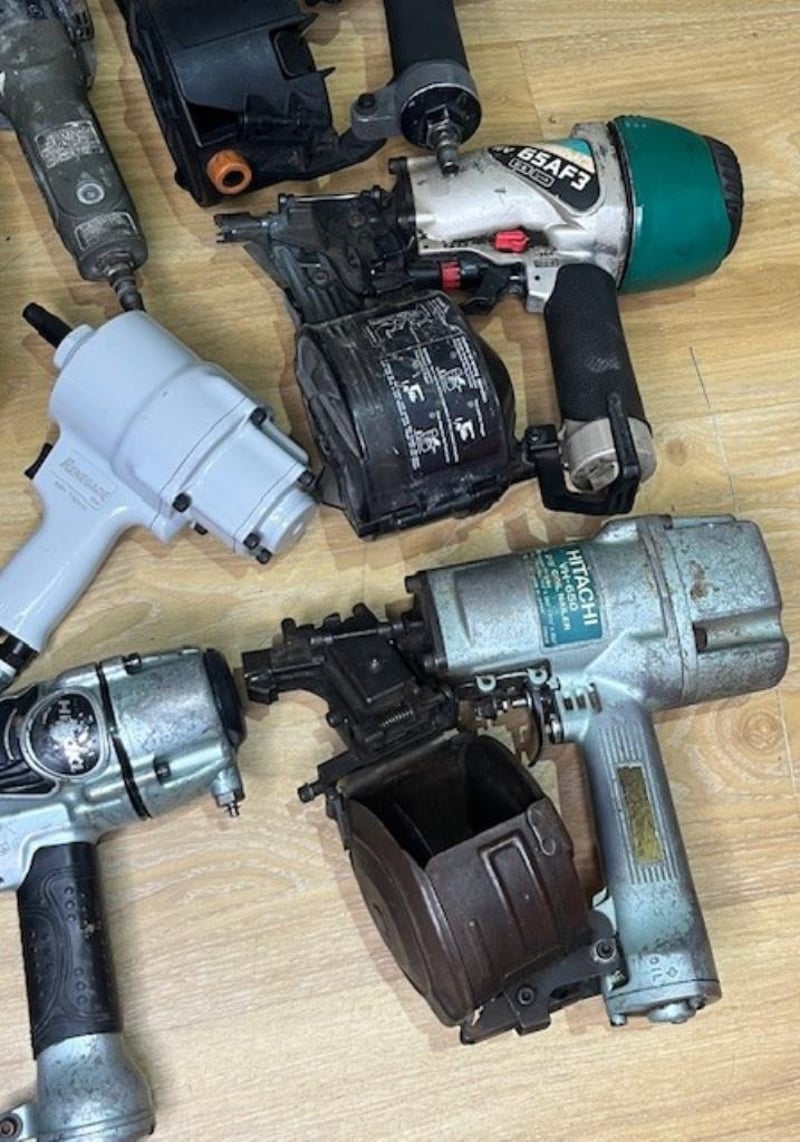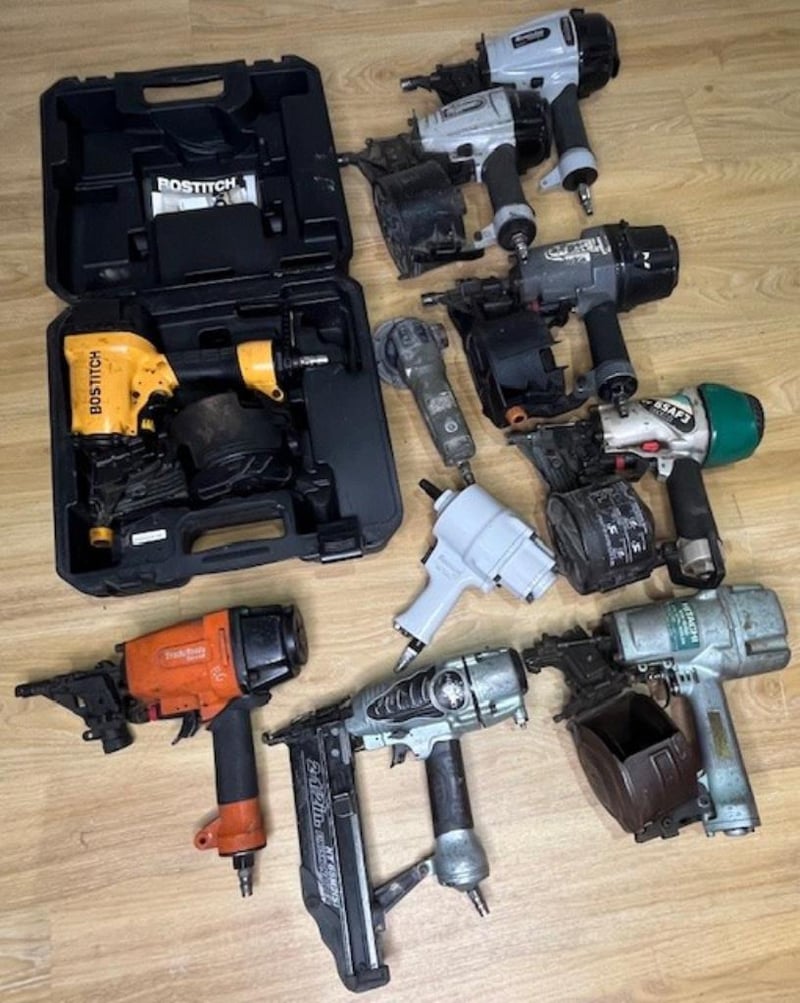 Assorted air tools. 2 x Hitachi coil nailers, 1 x TradeTools nailer, 1 x Hikoki finish nailer, 1 x Bostitch coil nailer, 1 x renegade wrench, 1 x Renegade angle grinder, 3 x Renegade coil nailers. Condition: Not working, untested, for parts or repair.