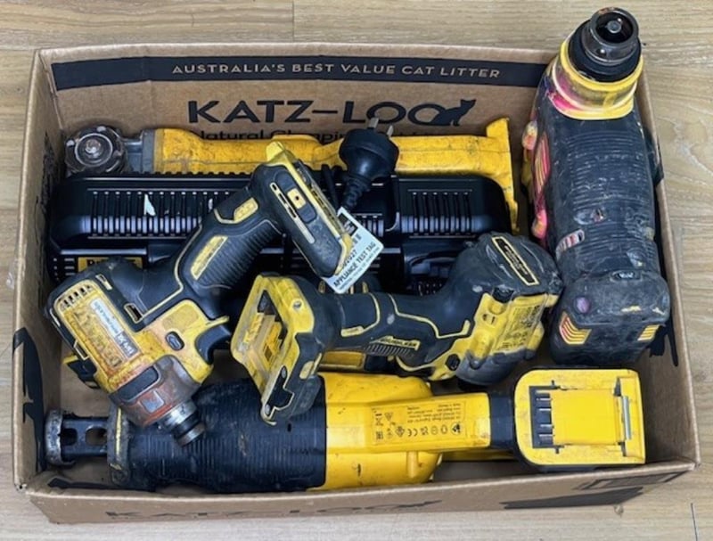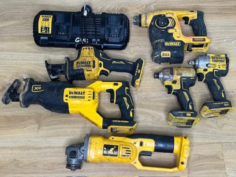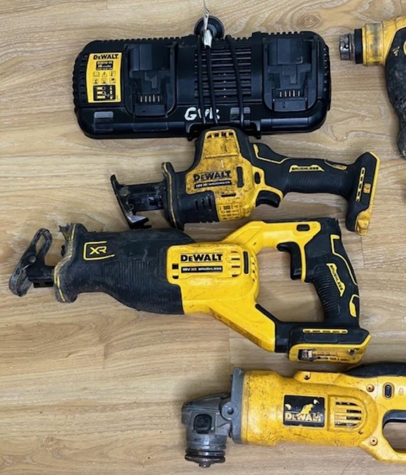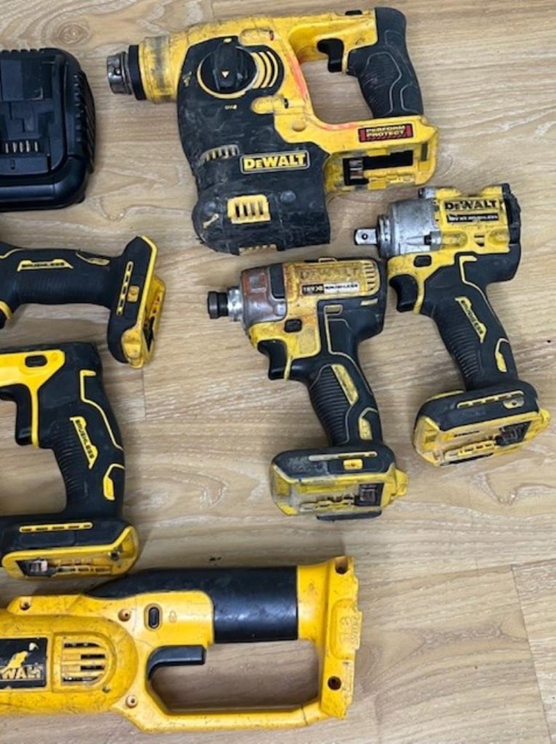 Cordless DeWalt 18V tools. 1 x DCH254 XE rotary hammer drill, 1 x DCF887 XE impact driver, 1 x DCS382 reciprocating saw, 1 x DCS369 reciprocating saw, 1 x DC411 XE angle grinder, 1 x DCF922 impact wrench, 1 x DCB132 XE 2 port charger. Skins only, no batteries. Condition: Not working, untested, for parts or repair.