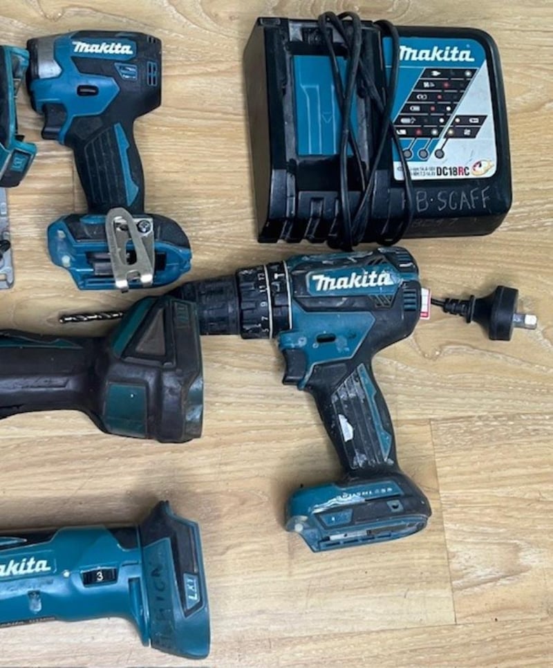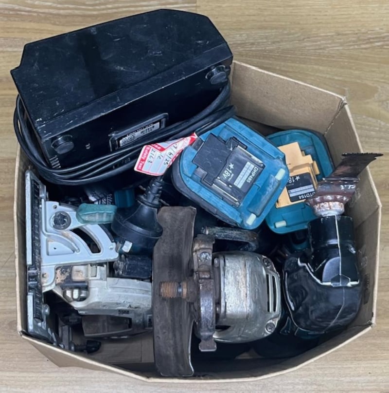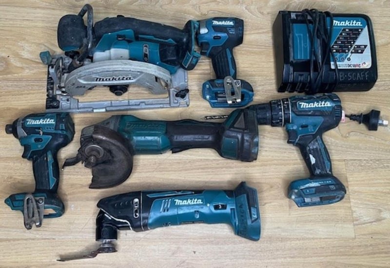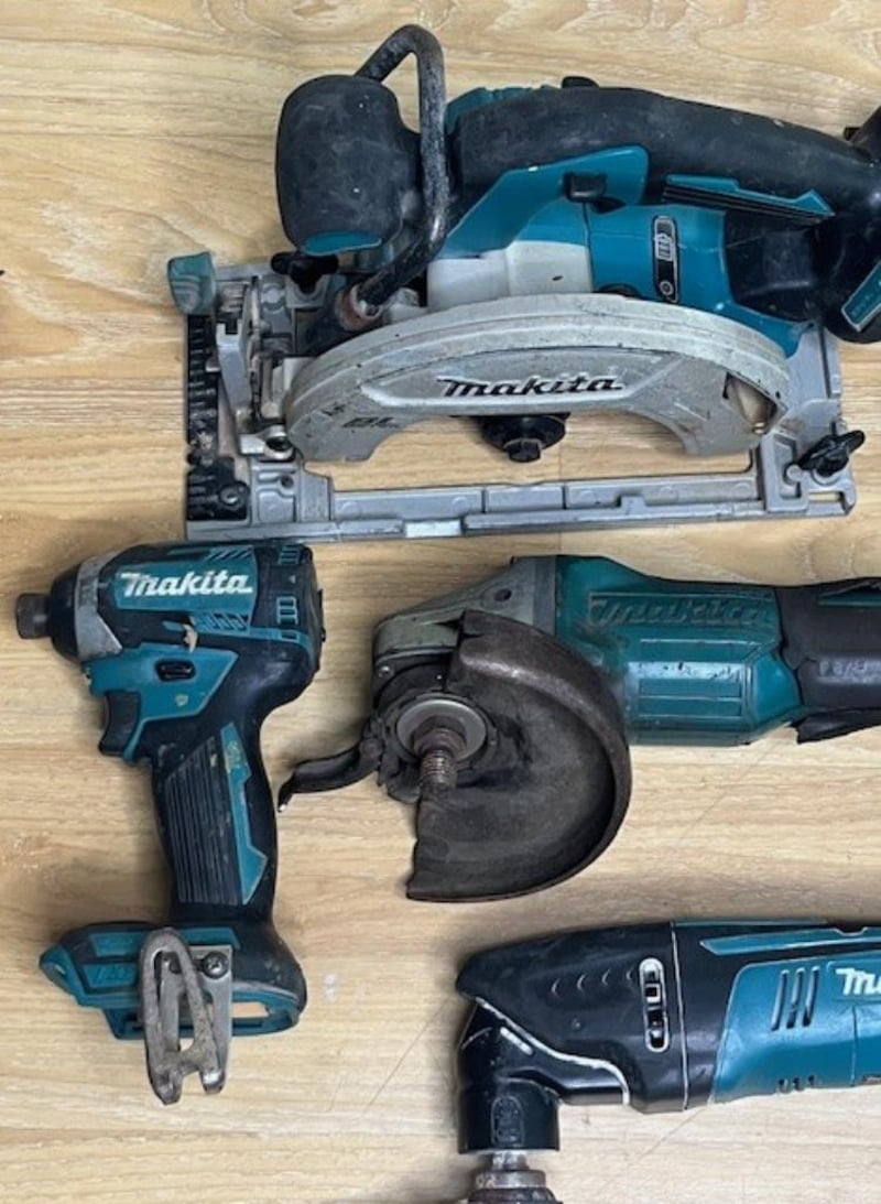 Cordless Makita 18V tools. 1 x DHS680 circular saw, 1 x DHP485 hammer drill, 1 x DTD154 impact driver, 1 x DTD173 impact driver, 1 x multifunction tool, 1 x angle grinder, 1 x DC18SD charger. Skins only, no batteries. Condition: Not working, untested, for parts or repair.