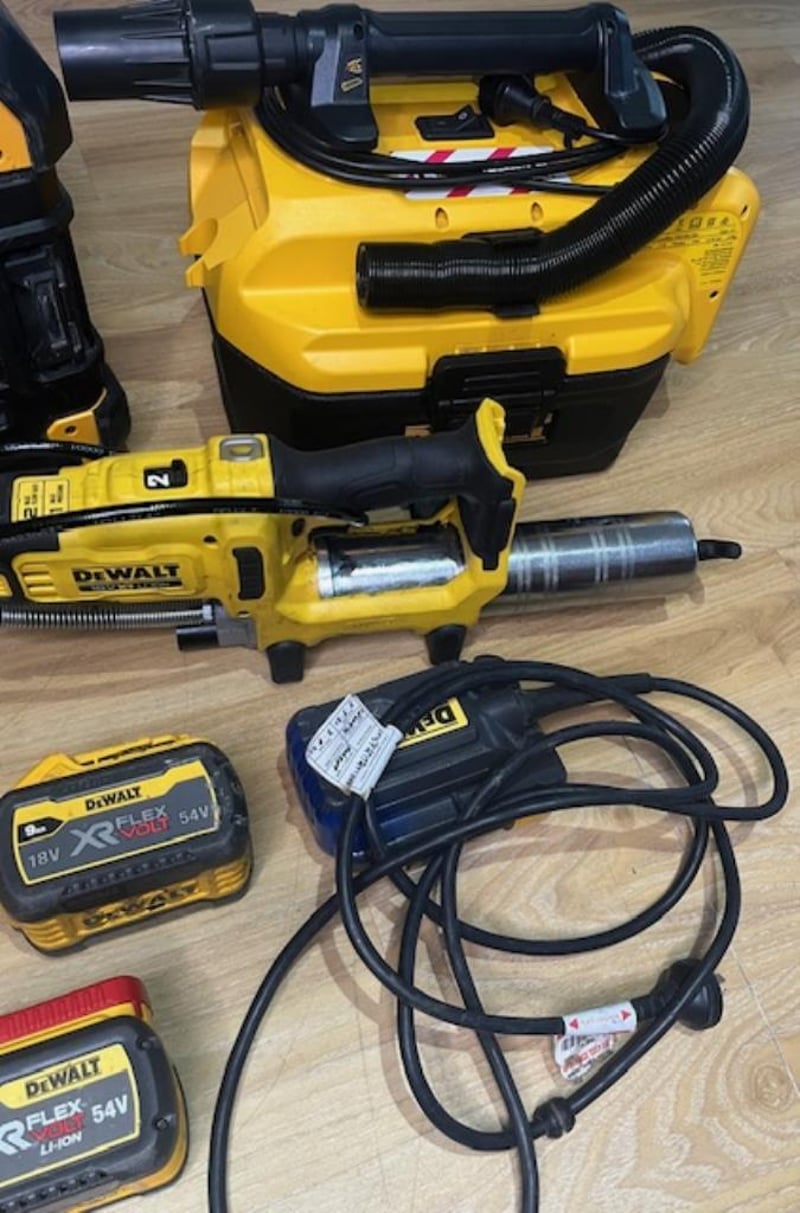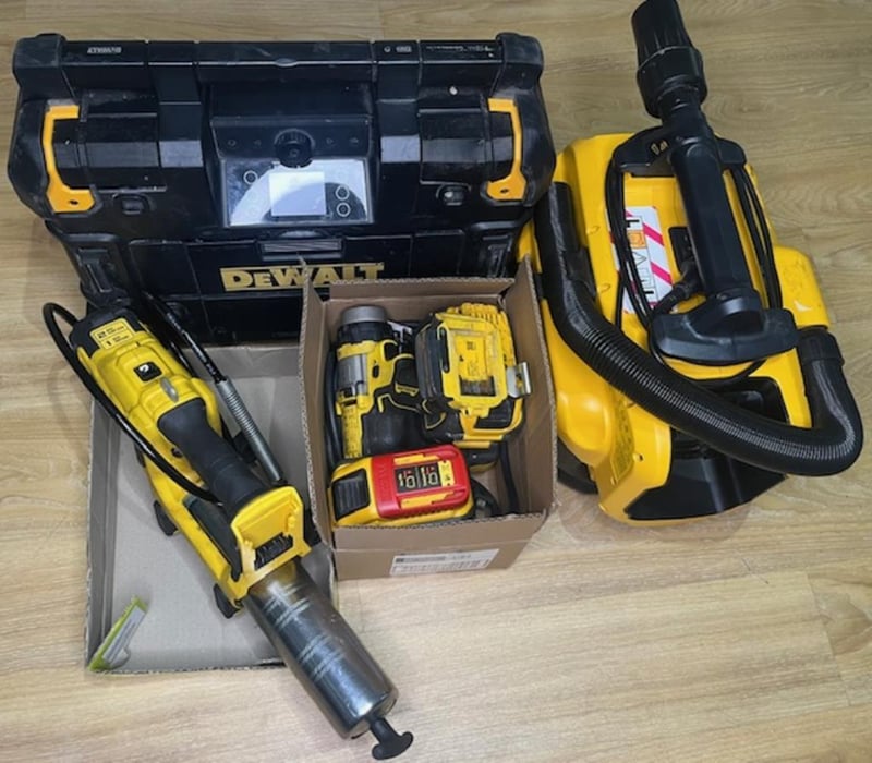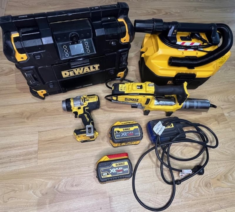 Cordless DeWalt 18V tools. 1 x DCGG581 XE grease gun, 1 x DWST1-81080 XE bluetooth stereo, 1 x DCV584L XE wet dry vac, 1 x DCD999 hammer drill, 1 x DCB500 XE power supply, 2 x XR FlexVolt 18/54V 9Ah batteries. Skins only. Condition: Not working, untested, for parts or repair.