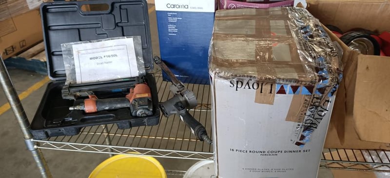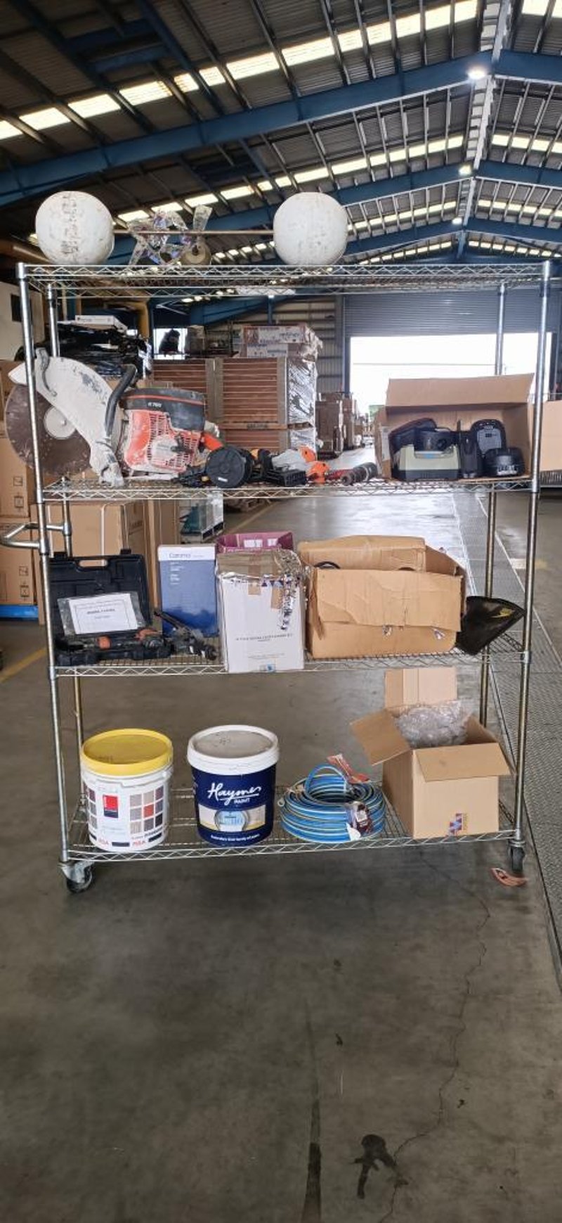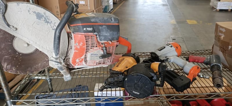 Assorted DIY Items Including Husqvarna K760, Air Guns, Air Hose, Paint, Torches & More SOLD AS LOT NOTE: CHROME RACK NOT INCLUDED NOTE: PICK UP ONLY NOTE: ITEMS ARE UNTESTED AND MAY NOT WORK NOTE: MUST BE COLLECTED WITHIN 48 HOURS OF AUCTION