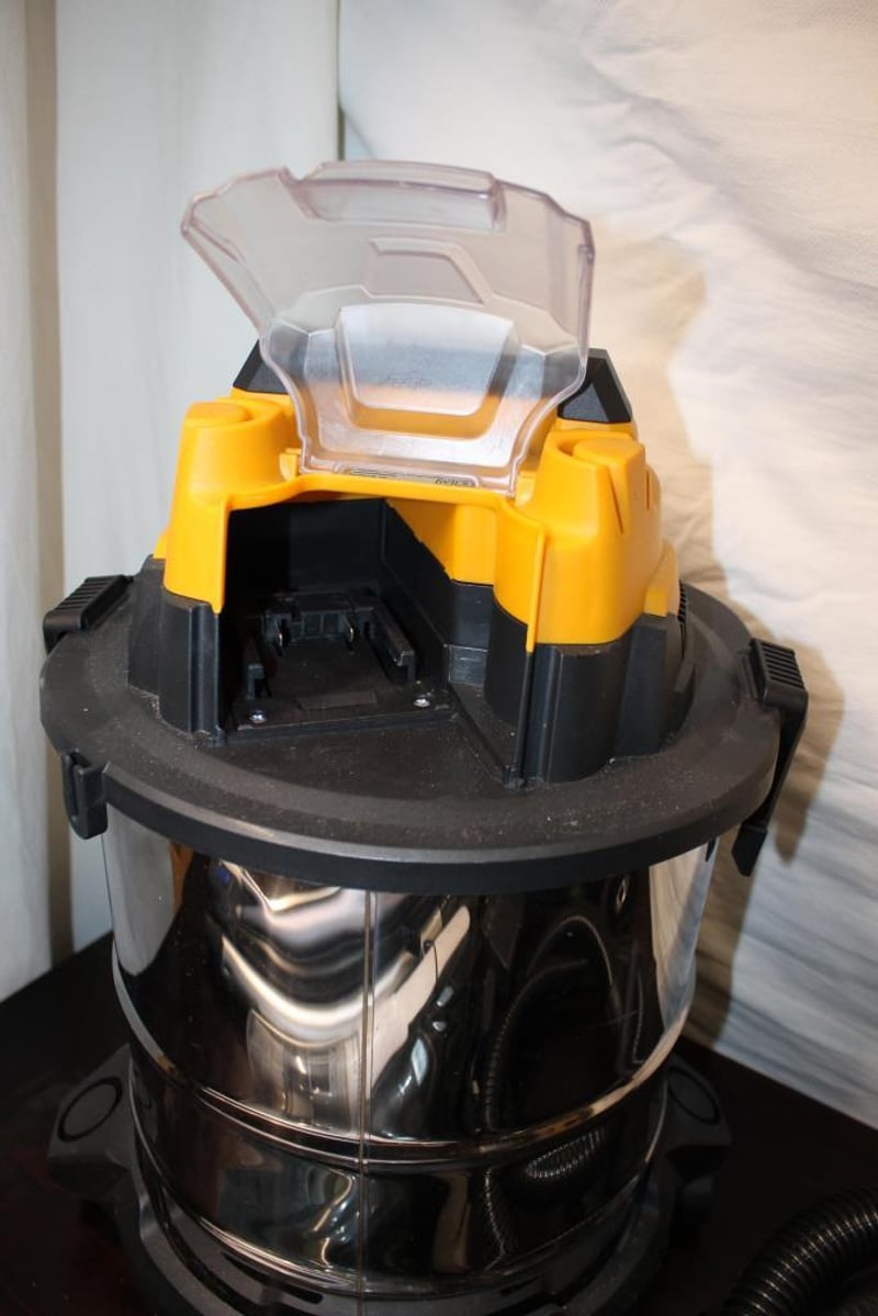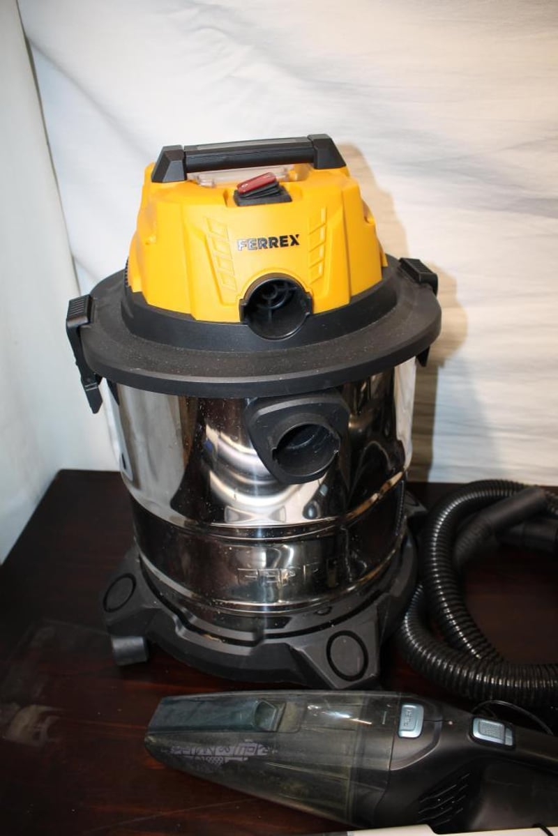 Ferrex wet and dry vacuum cleaner with stainless steel tank and yellow motor housing.