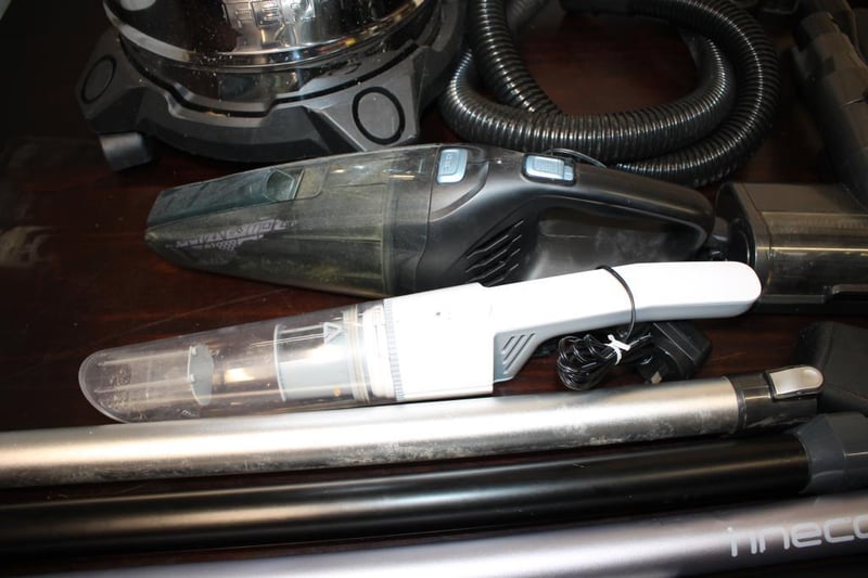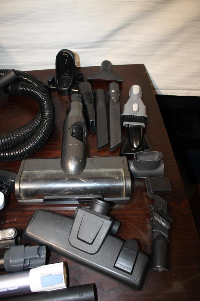 Includes hose, extension tubes, floor head, crevice tools and additional attachments as shown; condition untested.