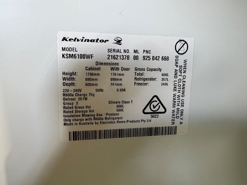 Kelvinator fridge/freezer Model: KSM6100WF Serial: 21621378 00 925 042 668 Note: working condition unknown