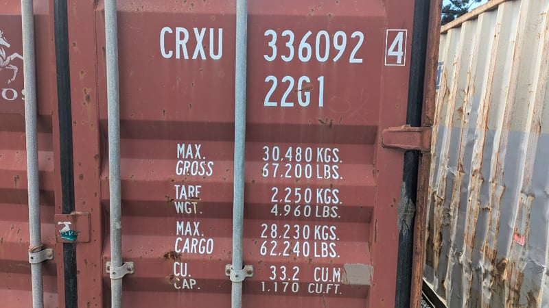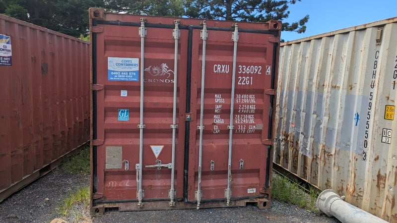 20 FT Container, CRXU336092 4- 22G1, Some Dents, Signs Of Rust Max Gross 30480 kg Tare 2250 kg Payload 28230 kg Cub. Cap. 33.2 CUM #Plant&Equipment Location: Coffs Harbour, NSW (Not Lloyds Branch) Contact: Glenn Aylward - 0418 665 100