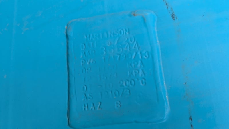 Large Tank, Martinson, MAR: 36644, PV6 - 171790/13, DP 1100 KPA, TP 1573 KPA, HAZ B, Date: 6/20, On Stand, Lifting Points, Valve and Taps, Dimensions: 620cm(H)×160cm(W) #Plant&Equipment Location: Coffs Harbour, NSW (Not Lloyds Branch) Contact: Glenn Aylward - 0418 665 100