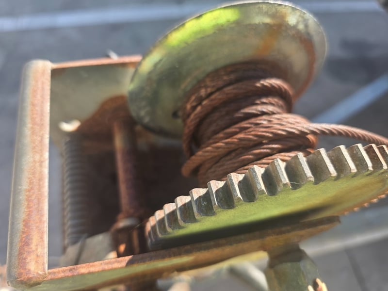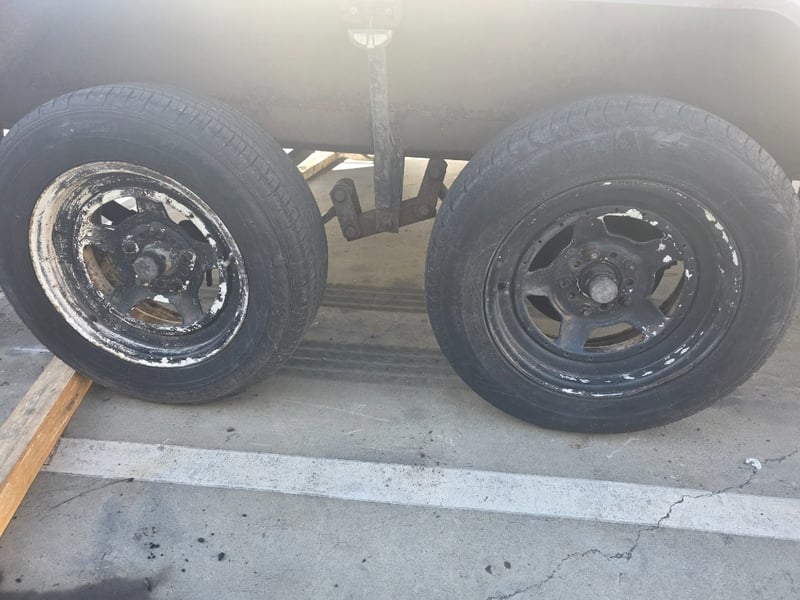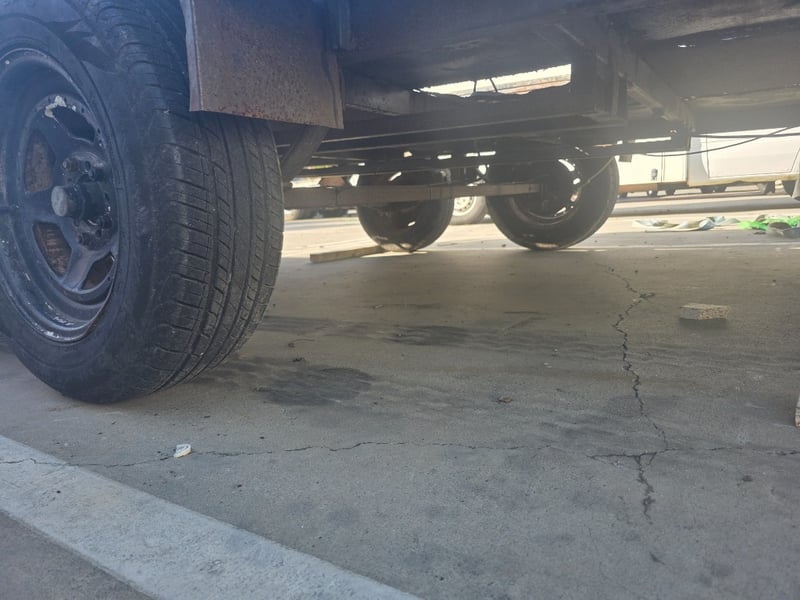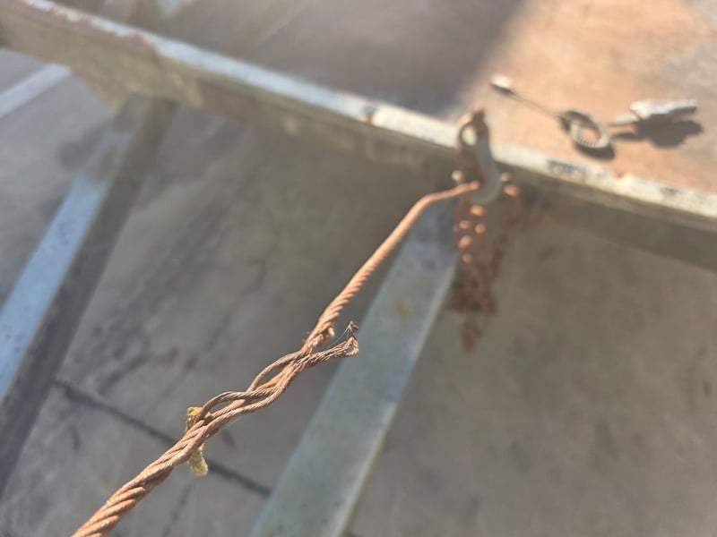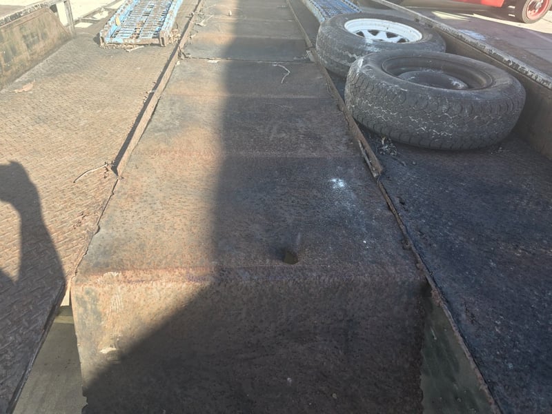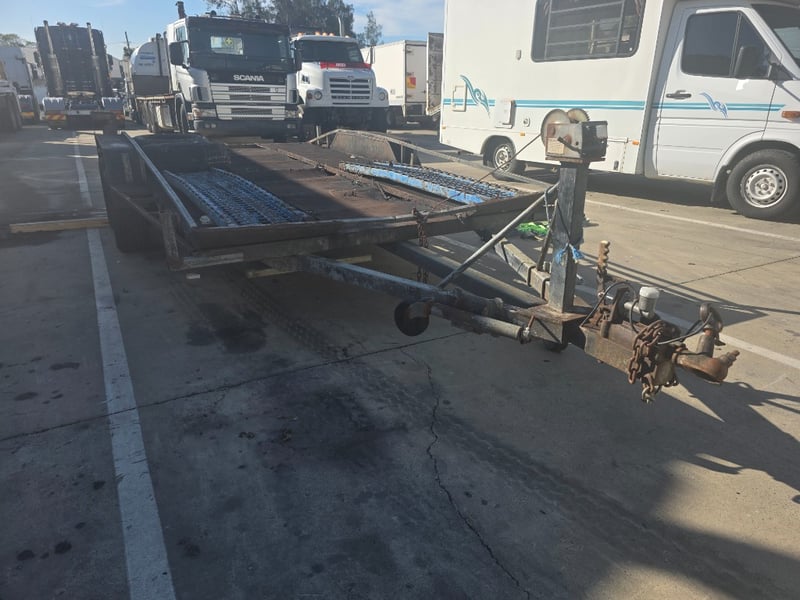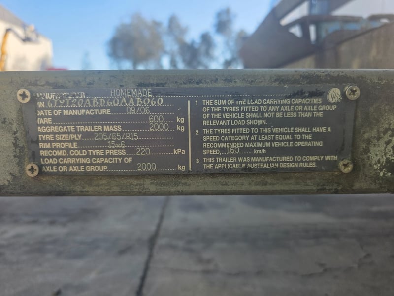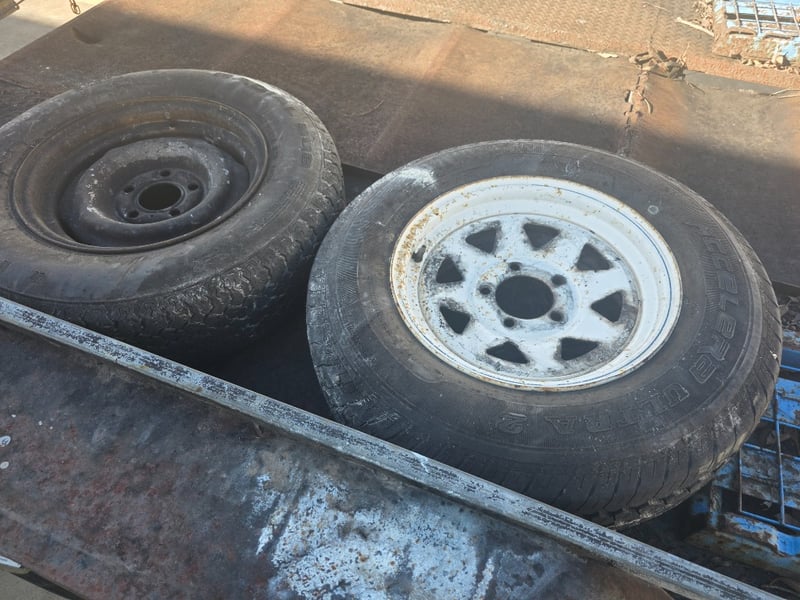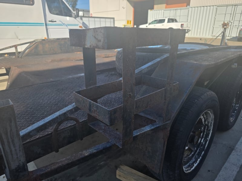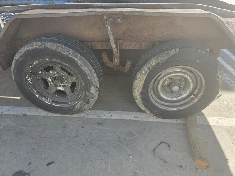 Description: dual axle, 7 pin plug, 50mm ball, 2 spare tyres,2 Ramps, large amount of rust throughout.