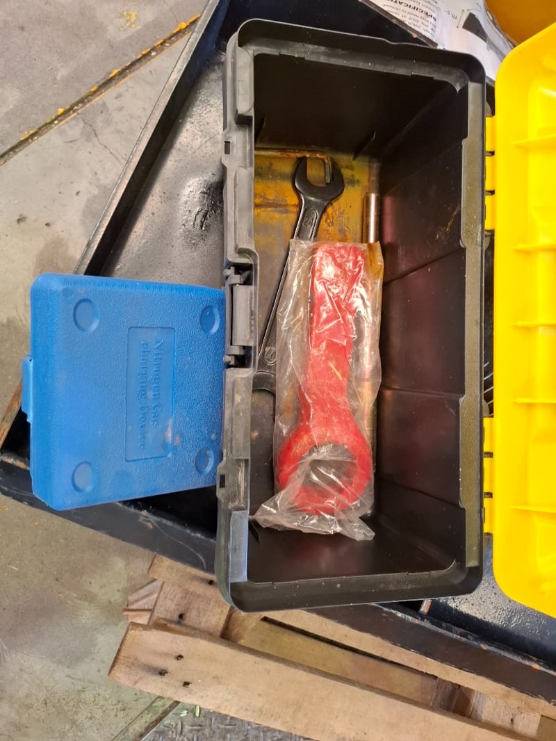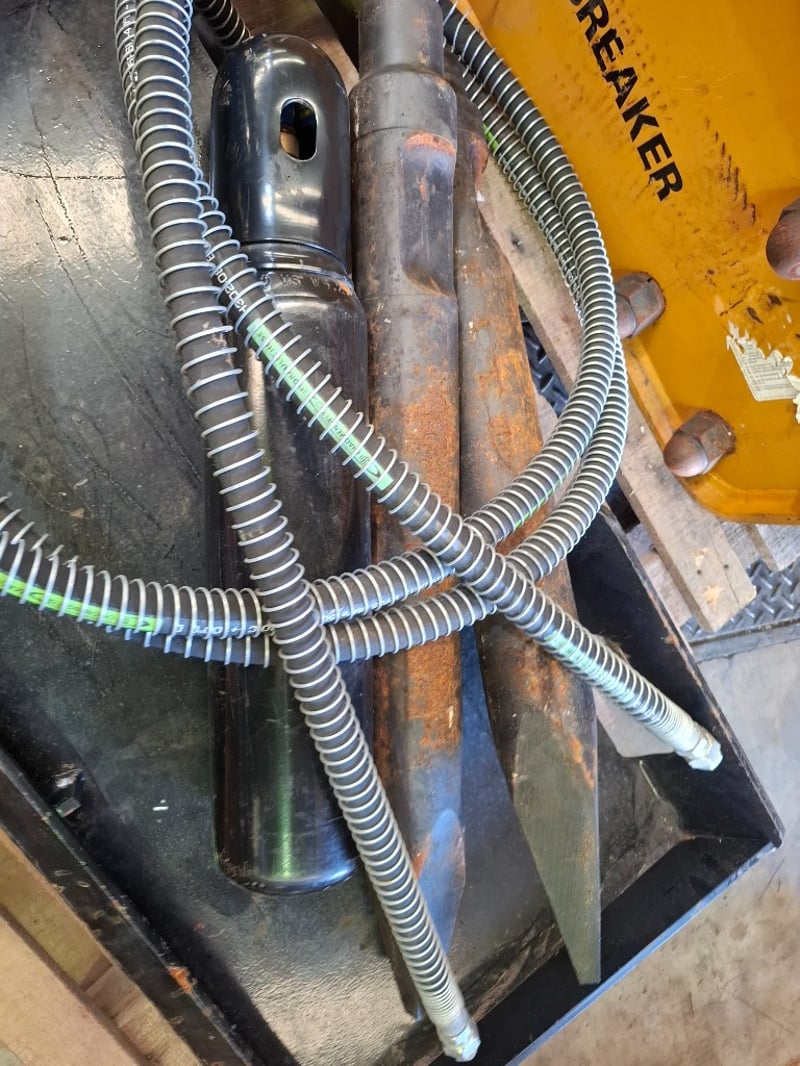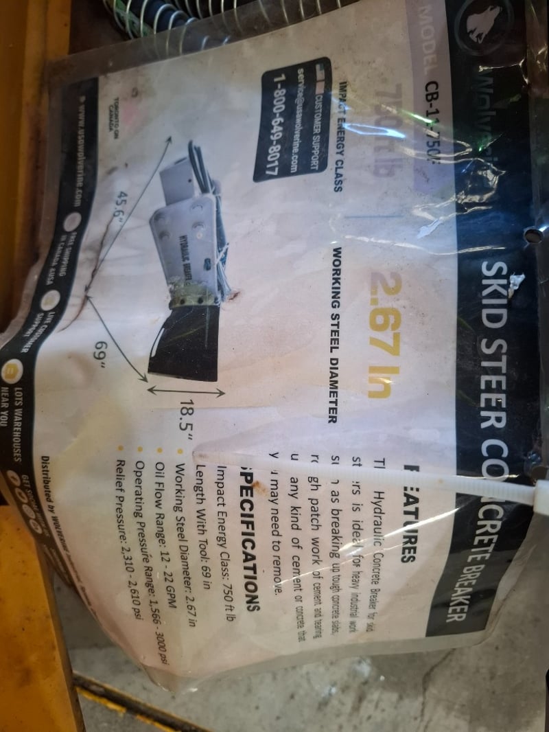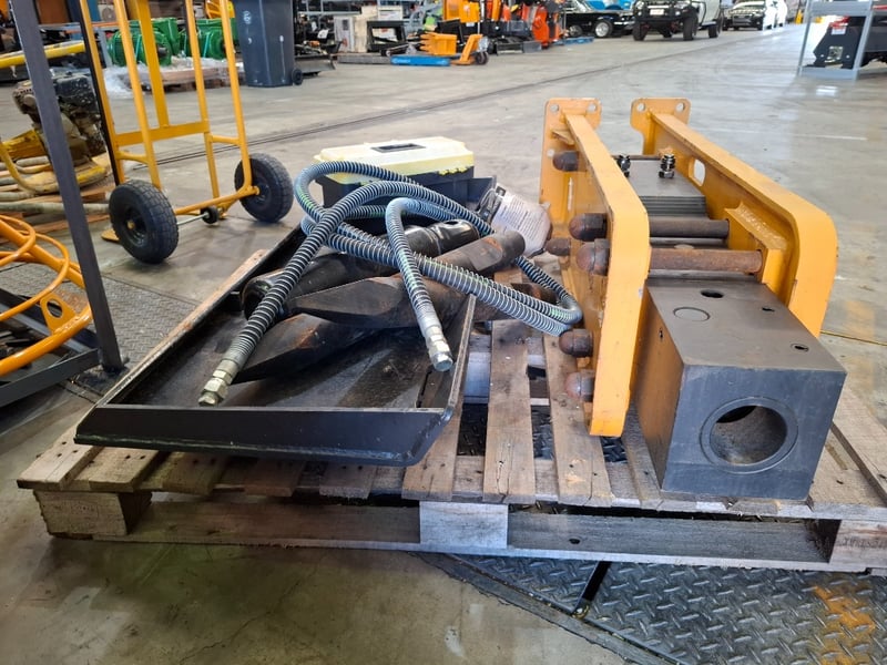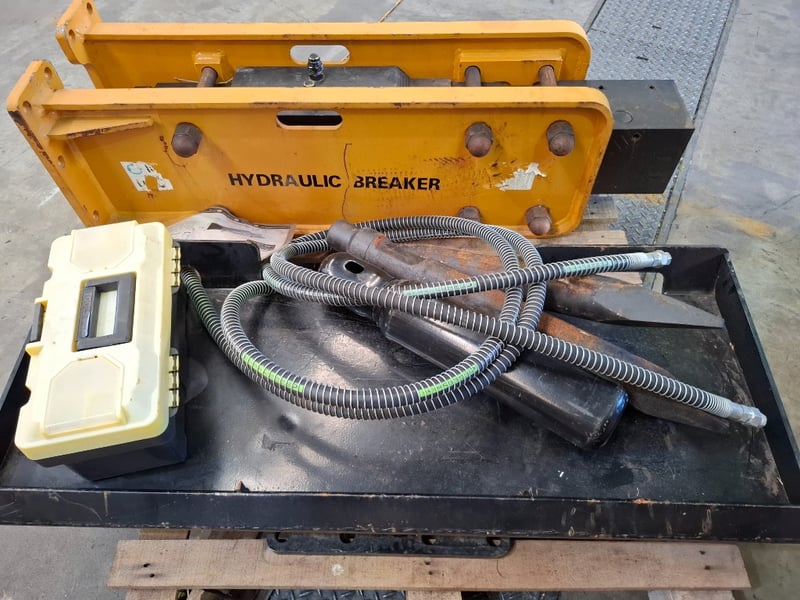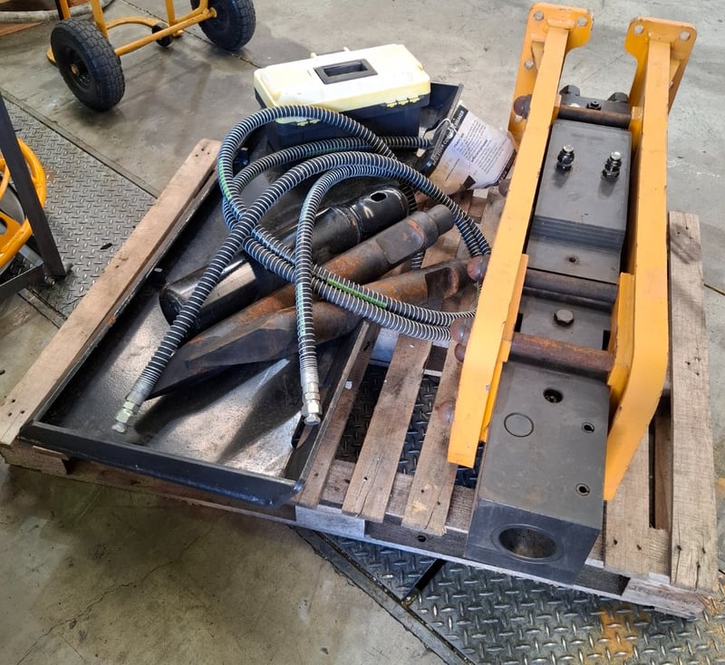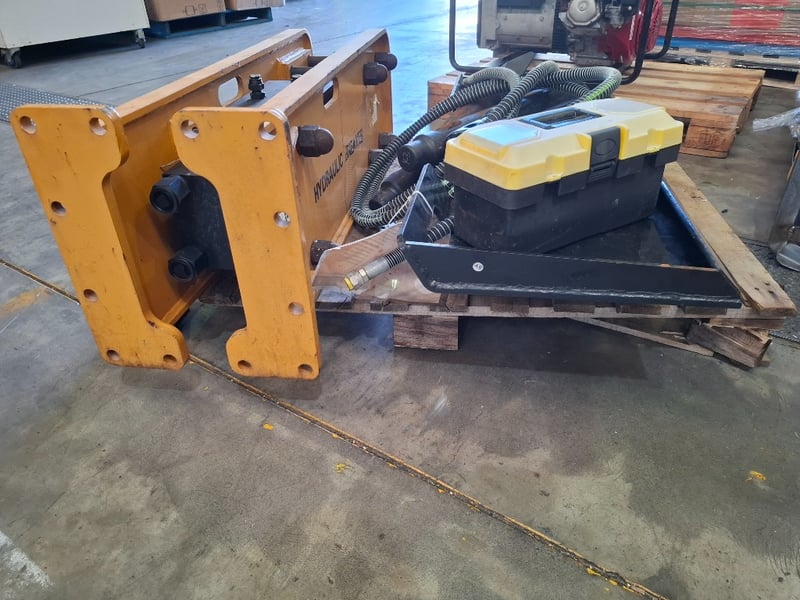 Hydraulic Breaker with tools and 2 spike attachments, reuseable gas bottle, tool box and skid steer backing plate and hoses.