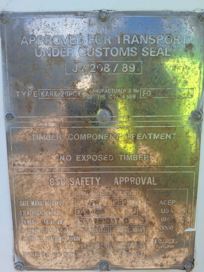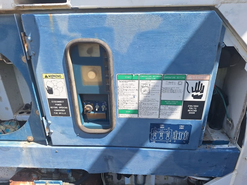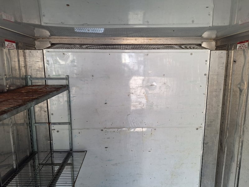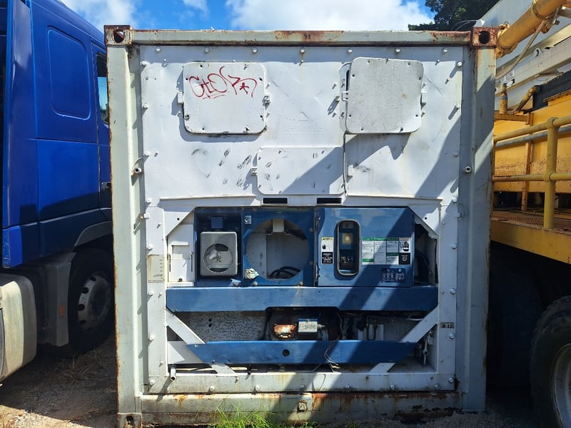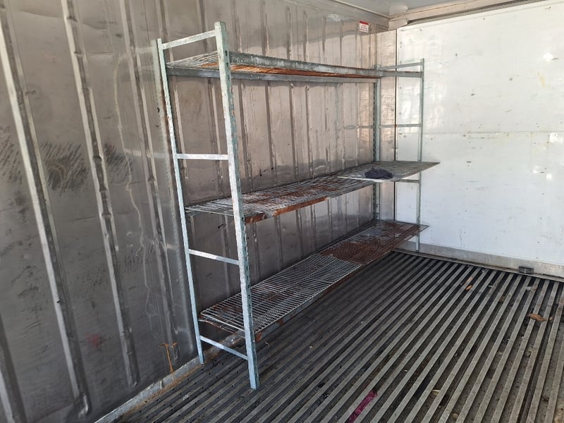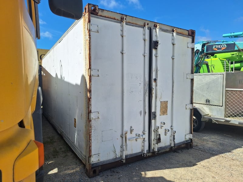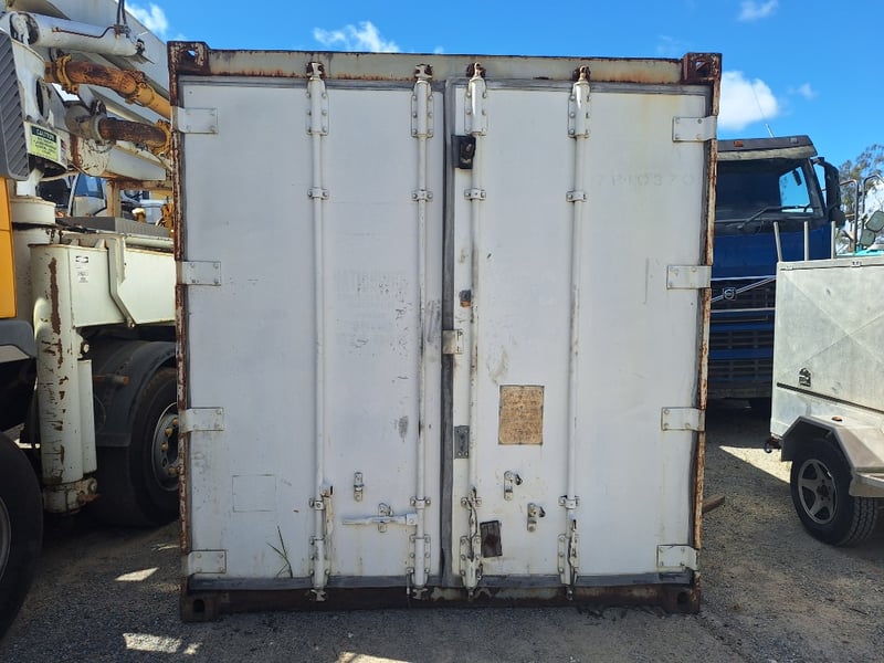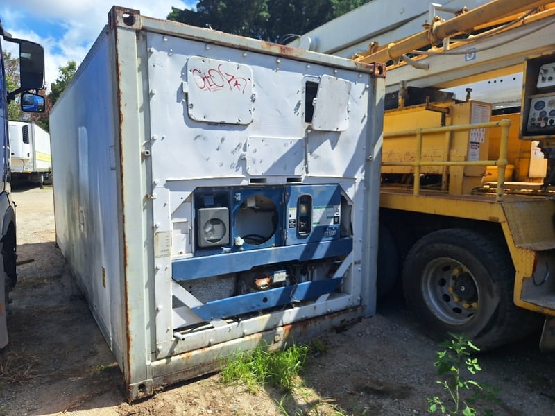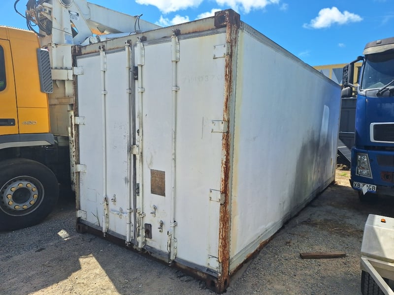 1989 20Ft Refrigeration Container, White, Double Front Lockable Doors, Rear Control Panel, Compressor For Refrigeration, Steel Grated Internal Floor, 3-Tier Internal Shelving, Approximately 2600mm (H) x 2500mm (W) x 6100mm