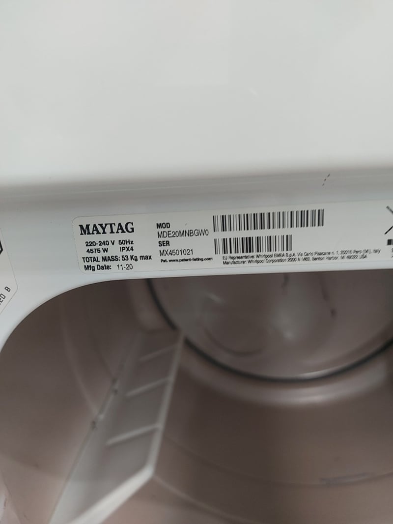 Commercial Dryer MayTag, Model MDE20MNBGW0, Dimensions 72cmD×68cmW×104cmH