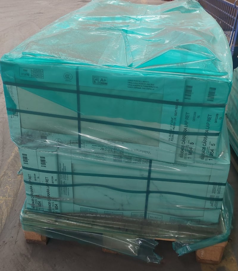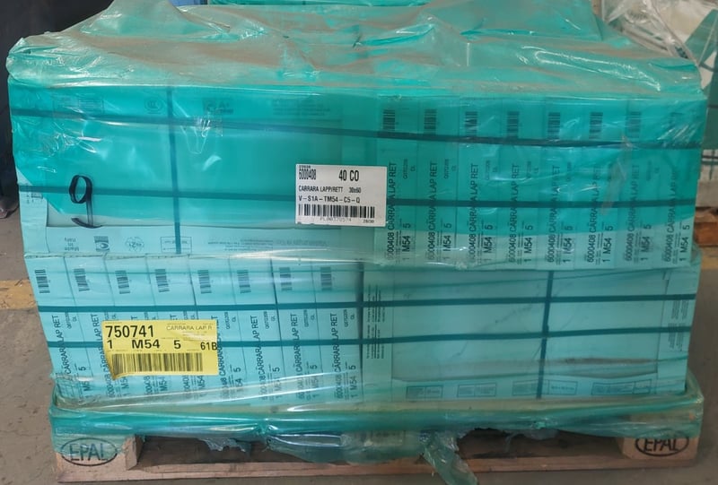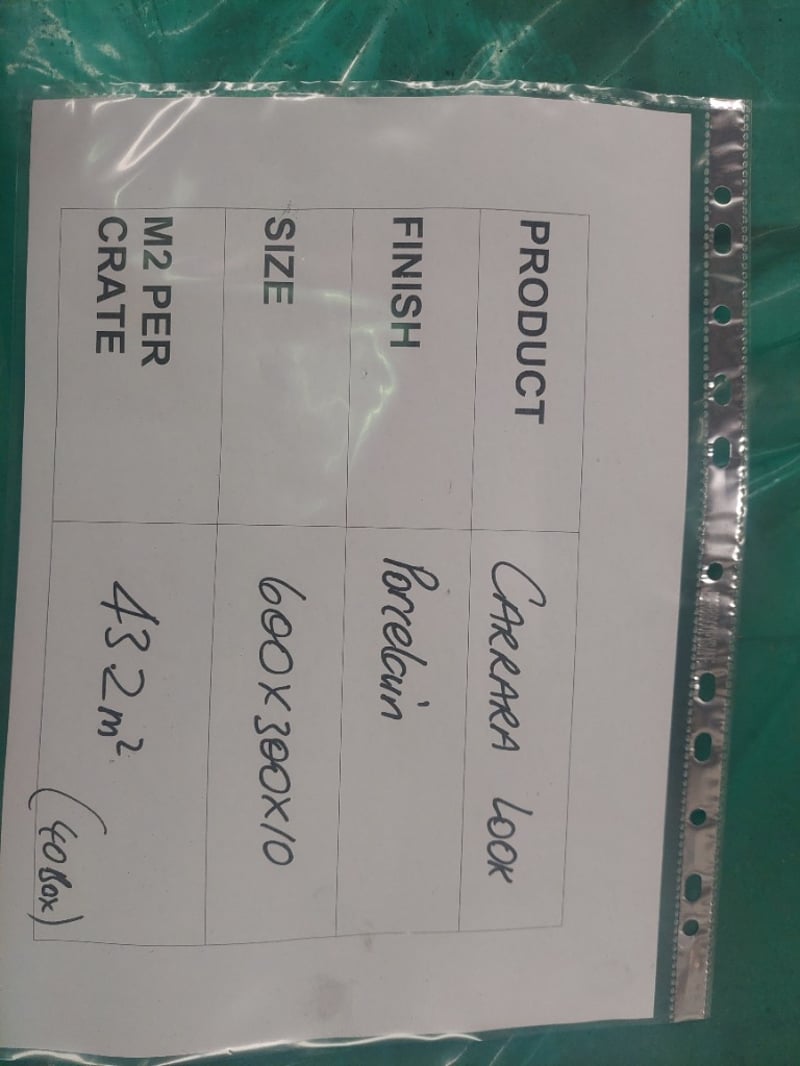 Carrara look, porcelain finish tiles.Dimensions: 30x60x1cmM2 per crate: 43.2m squared. 40 boxes.Bid per pallet.Note: signs of wear.