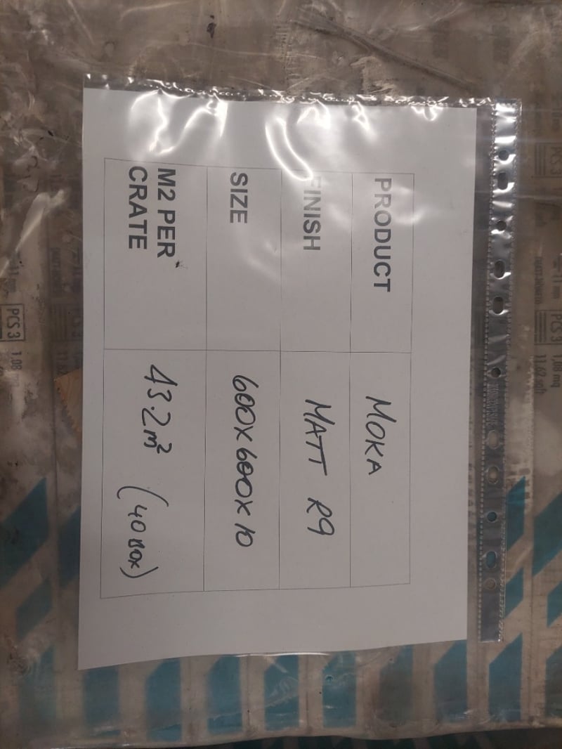 MOKA, matt R9 finish tiles.Dimensions: 60x60x1cmM2 per crate 43.2m squared.Bid per pallet.Note: signs of wear.