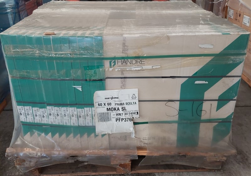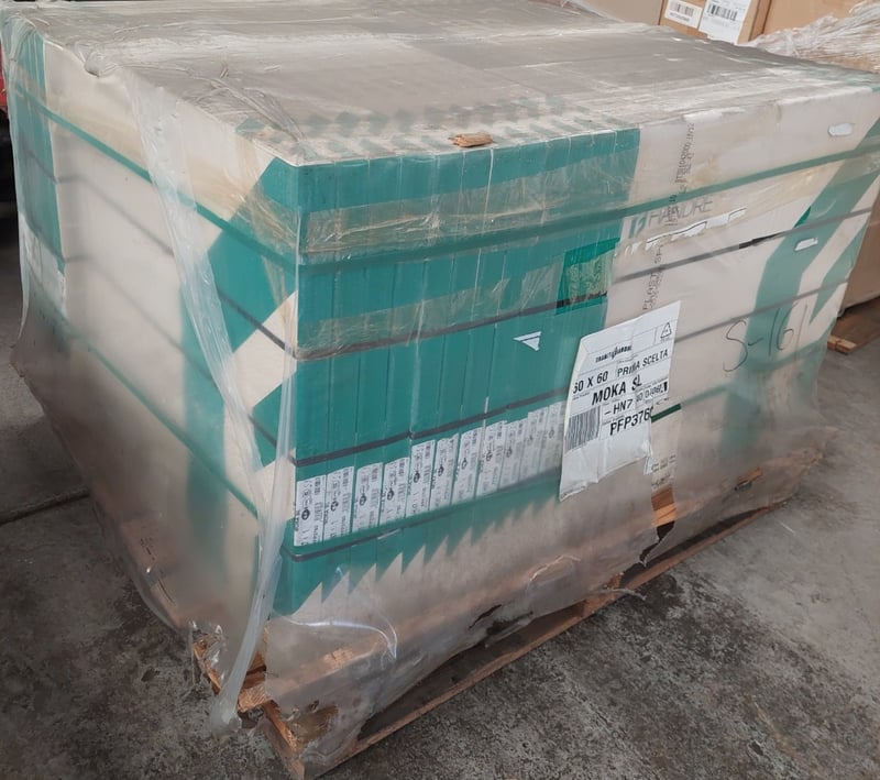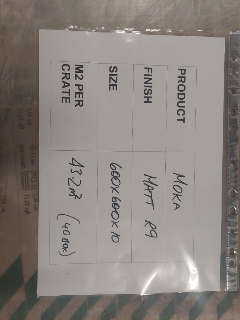 MOKA, matt R9 finish tiles.Dimensions: 60x60x1cmM2 per crate: 43.2m squared.Bid per pallet.Note: signs of wear.