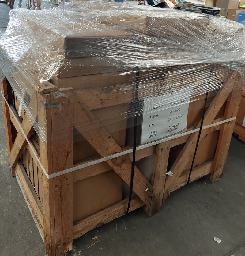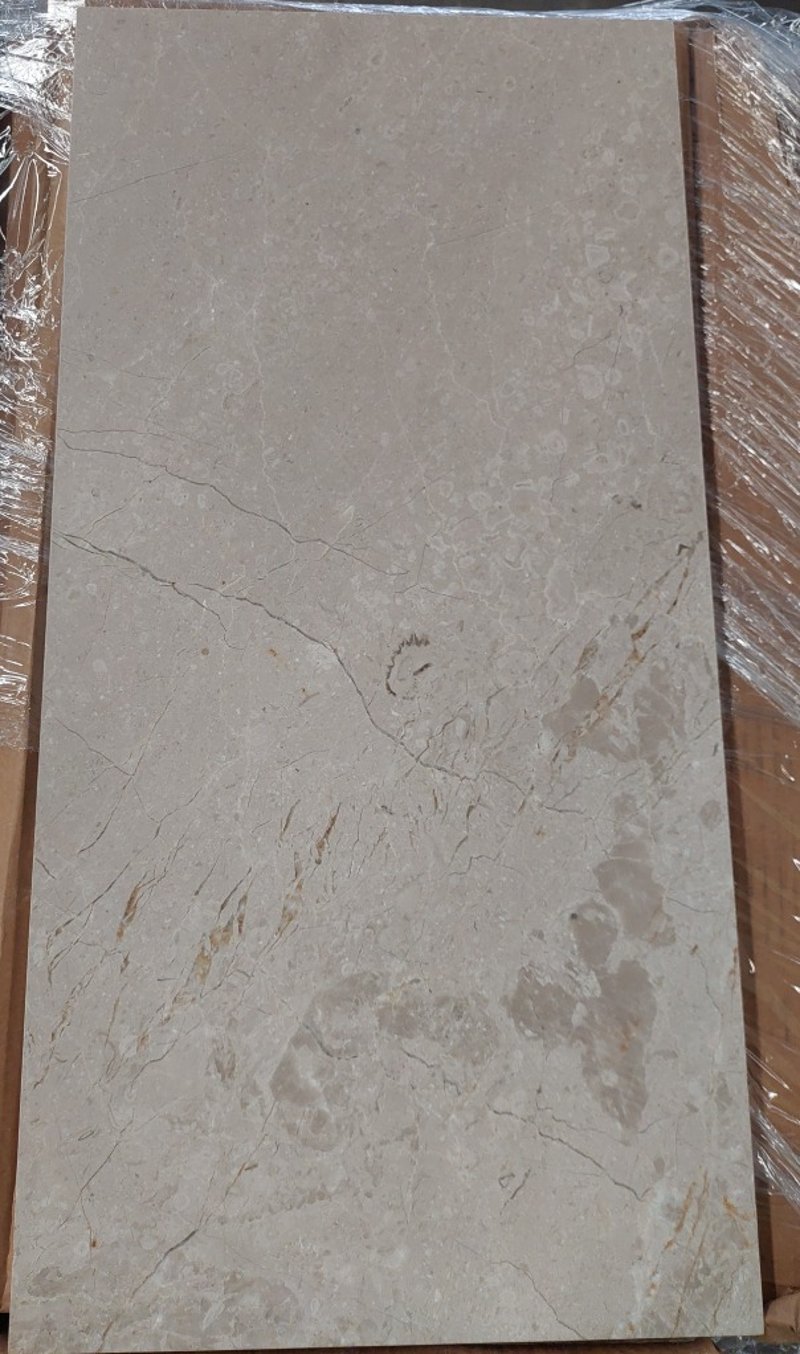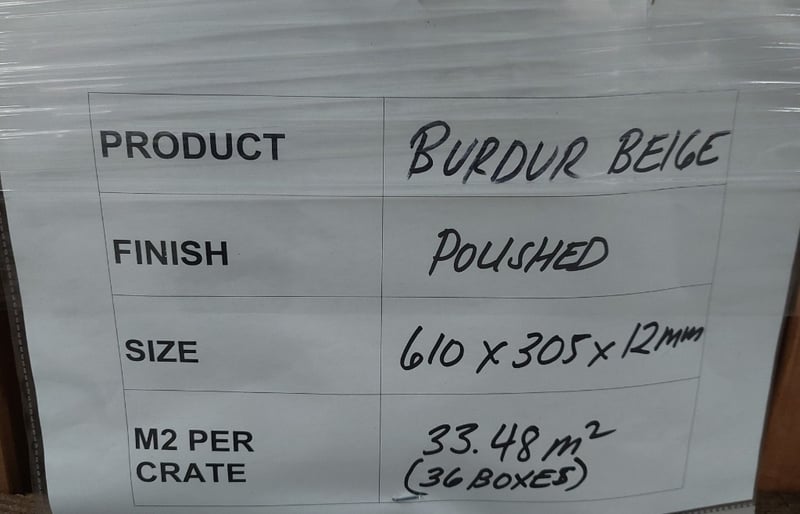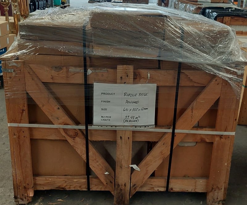 Burdur beige, polished finish tiles.Dimensions: 61x30.5x1.2cm M2 per crate: 33.48m squared.Bid per pallet.Note: signs of wear.