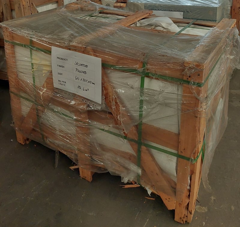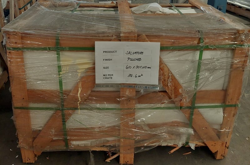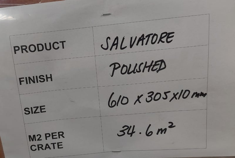 Salvatore, polished finish tiles.Dimensions: 61x30.5x1cmM2 per crate: 34.6m squared.Bid per pallet.Note: signs of wear.