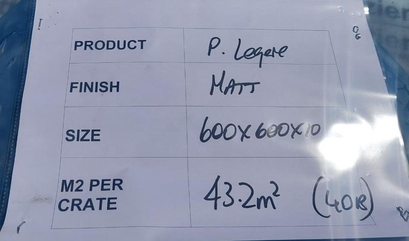 P. Legere, matt finish tiles.Dimensions: 60x60x1cmM2 per crate: 43.2 m squared.Bid per pallet.Note: signs of wear.
