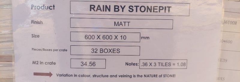 Rain by stonepit, matt finish tiles.Dimensions: 30x60x1cmM2 per crate: 34.56m2Bid per pallet.Note: signs of wear.
