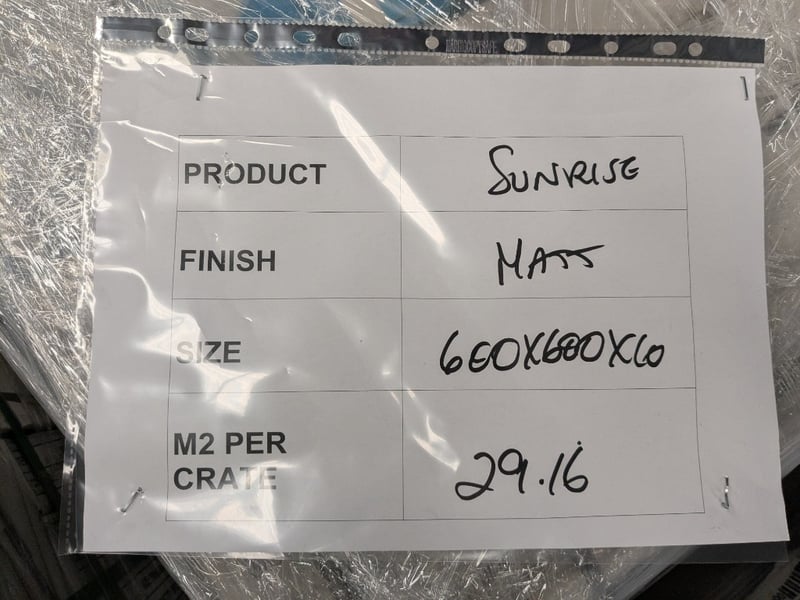 Sunrise by islatiles, matt finish tiles.Dimensions: 60x60x1cmM2 per crate: 29.16m squared.Bid per pallet.Note: signs of wear.